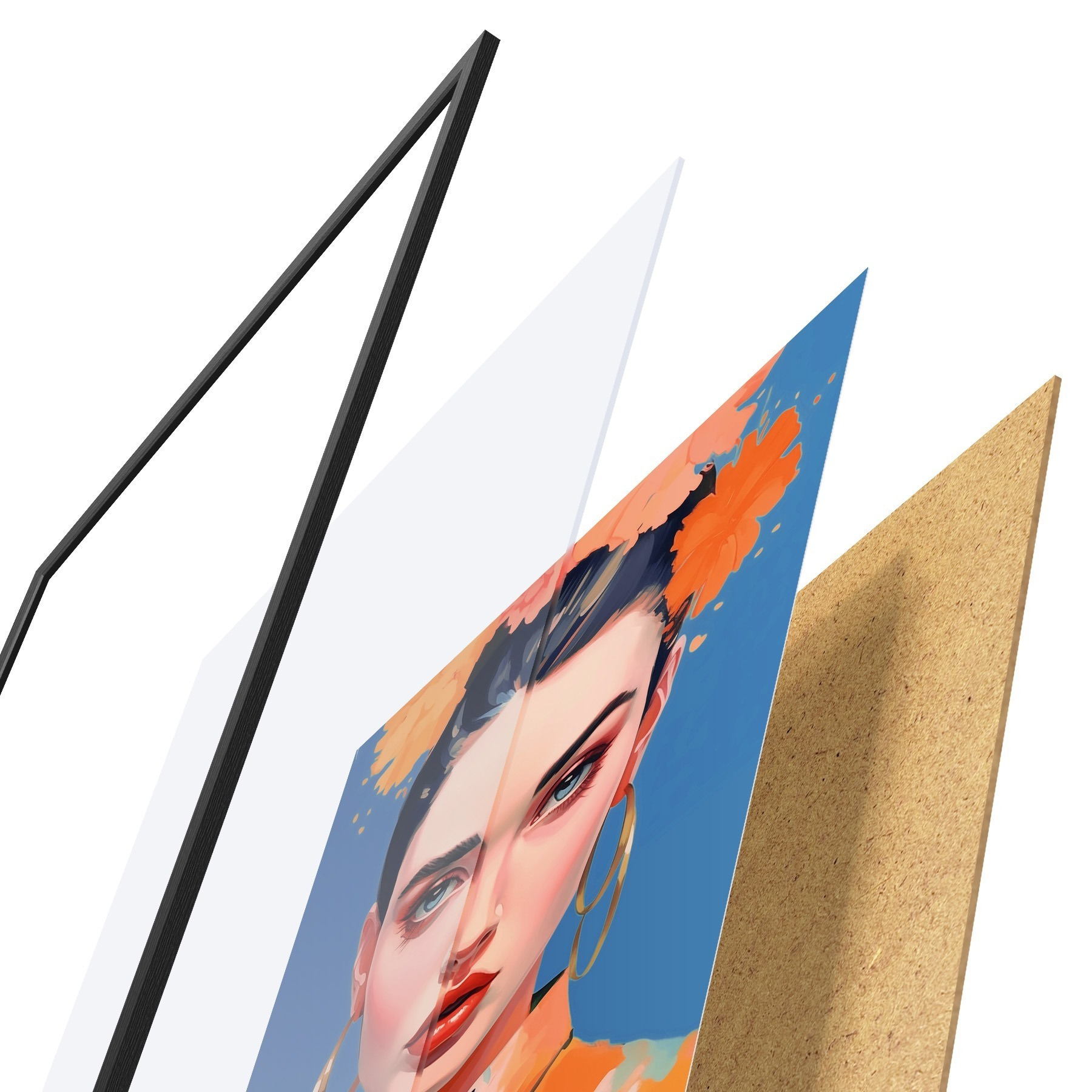 Le poster se compose d'un cadre, d'un plexiglas, d'une image imprimée et d'un support en aggloméré. Le poster peut être immédiatement accroché au mur grâce aux fixations au dos.