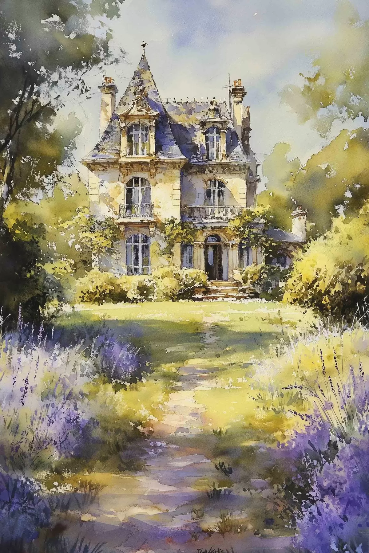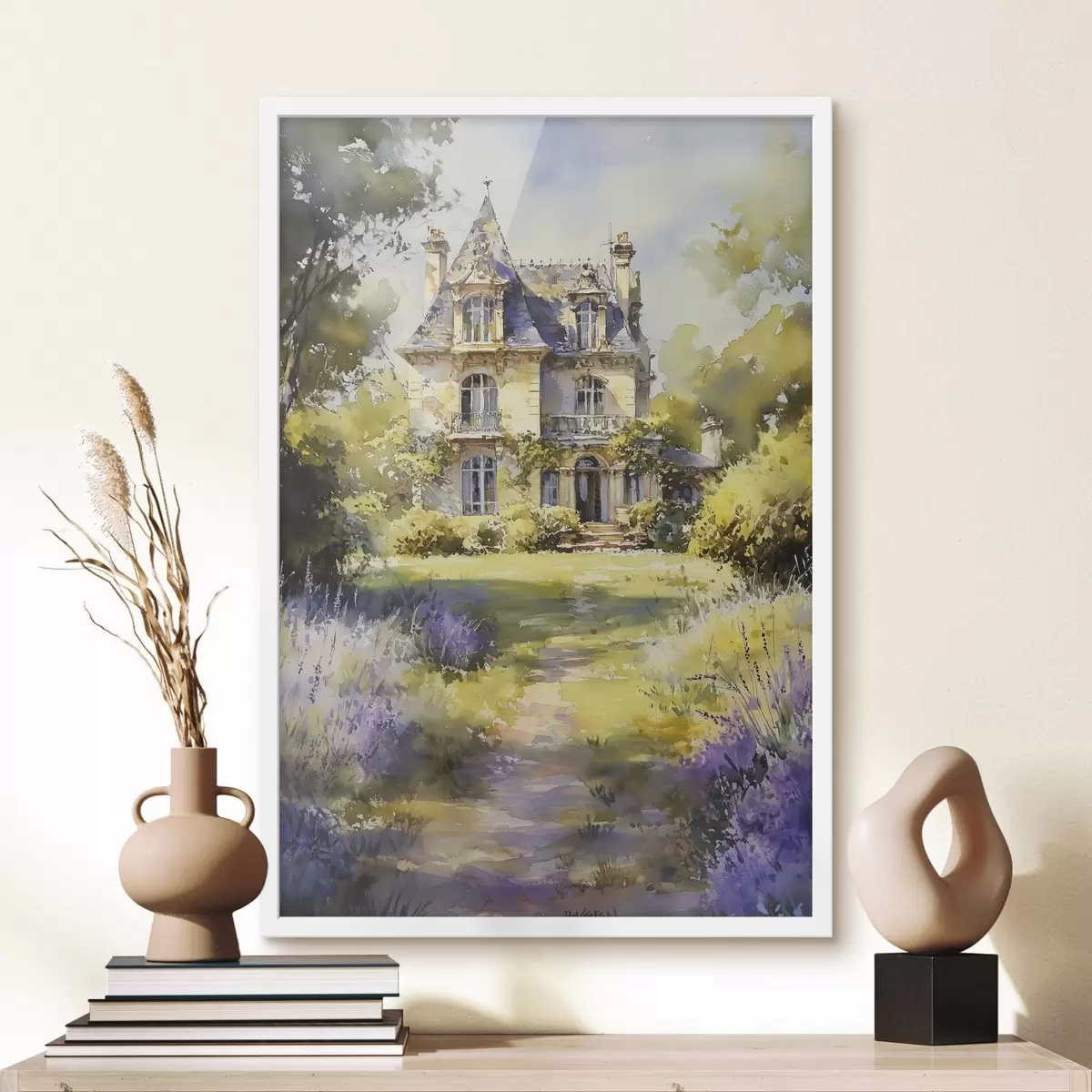 Affiche Chalet de campagne français, style aquarelle, champs de lavande Non f44501
