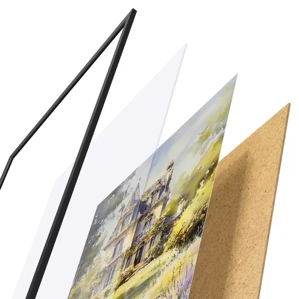 Le poster se compose d'un cadre, d'un plexiglas, d'une image imprimée et d'un support en aggloméré. Le poster peut être immédiatement accroché au mur grâce aux fixations au dos.