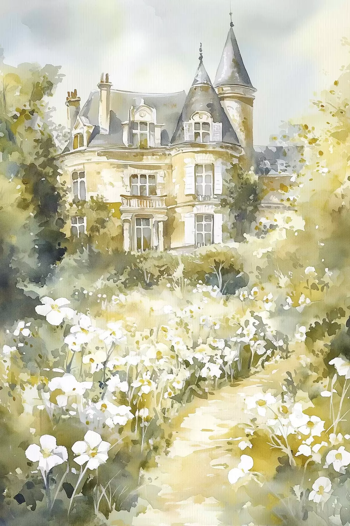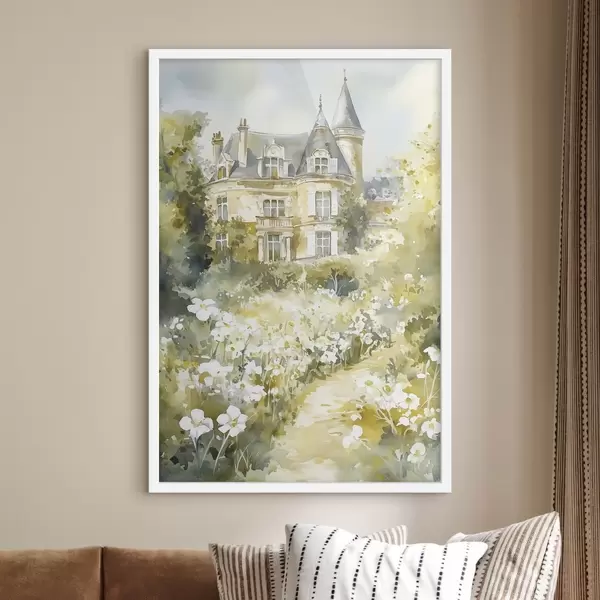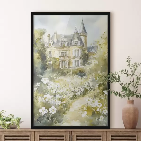 Affiche Beau château avec de la verdure et des fleurs blanches, style aquarelle Non f44506