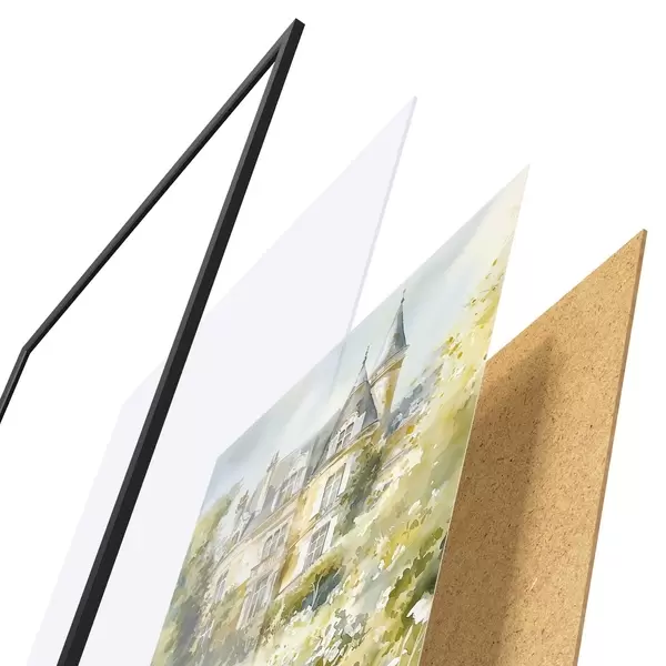 Le poster se compose d'un cadre, d'un plexiglas, d'une image imprimée et d'un support en aggloméré. Le poster peut être immédiatement accroché au mur grâce aux fixations au dos.