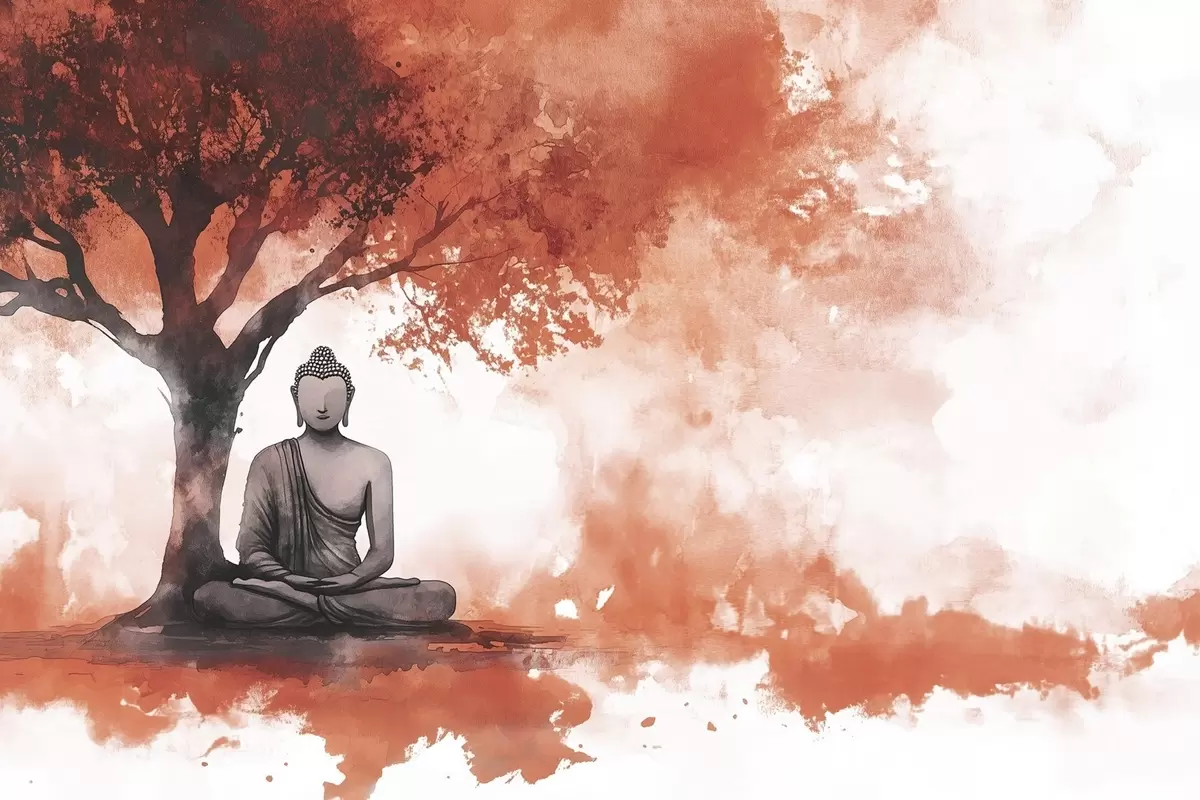 Affiche Bouddha assis sous l'arbre, méditation, spirituel, couleurs orange f44512
