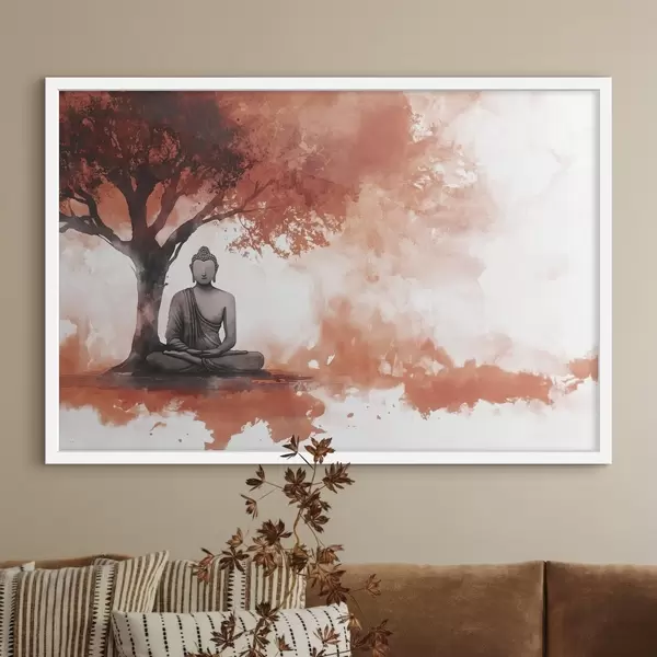 Affiche Bouddha assis sous l'arbre, méditation, spirituel, couleurs orange Non f44512