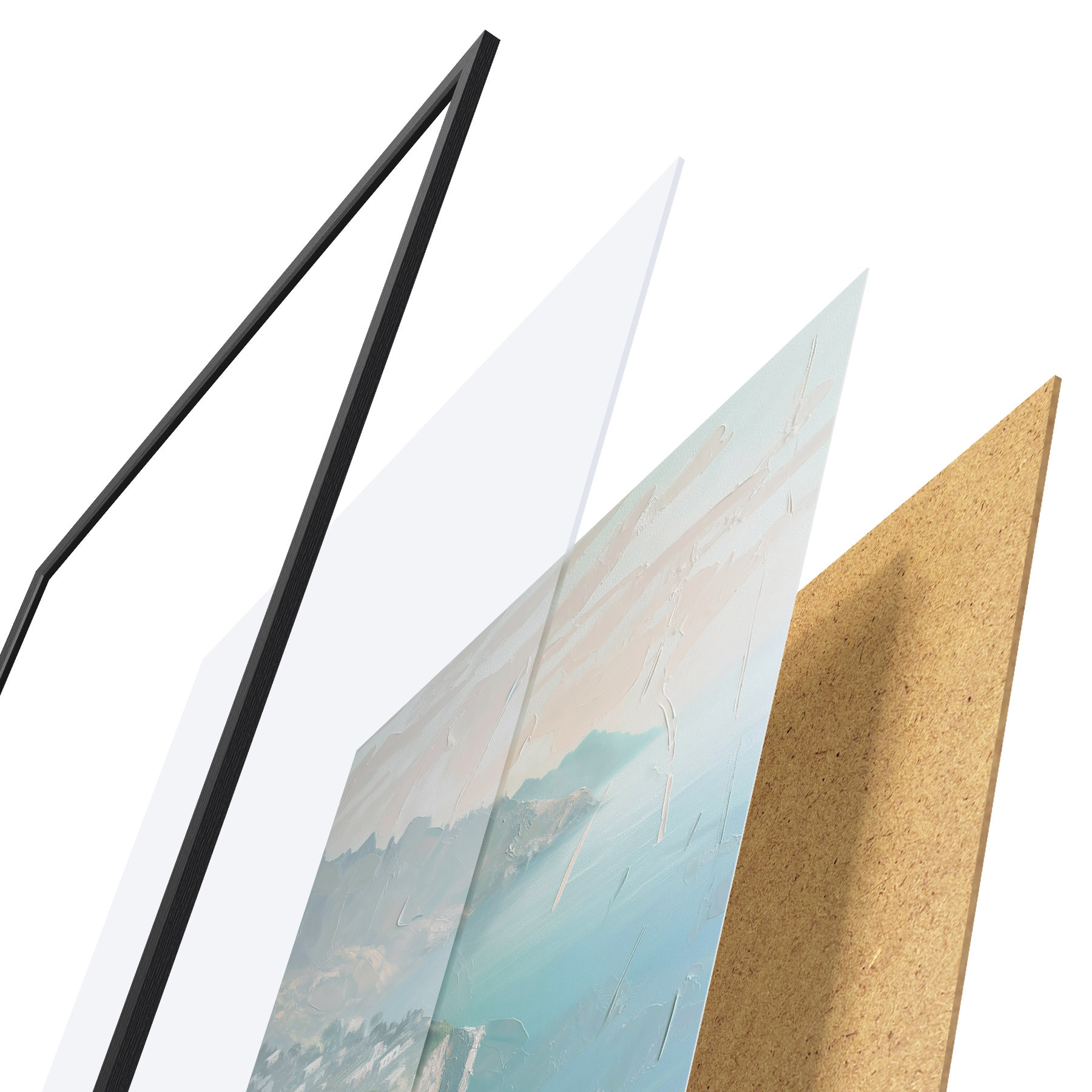 Le poster se compose d'un cadre, d'un plexiglas, d'une image imprimée et d'un support en aggloméré. Le poster peut être immédiatement accroché au mur grâce aux fixations au dos.