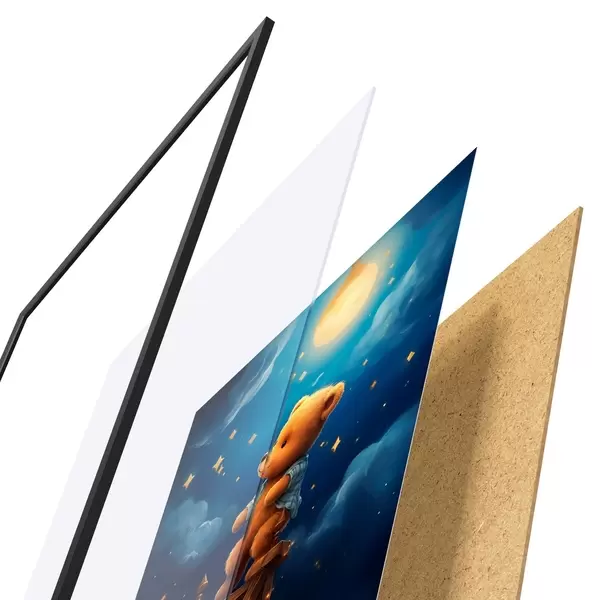 Le poster se compose d'un cadre, d'un plexiglas, d'une image imprimée et d'un support en aggloméré. Le poster peut être immédiatement accroché au mur grâce aux fixations au dos.