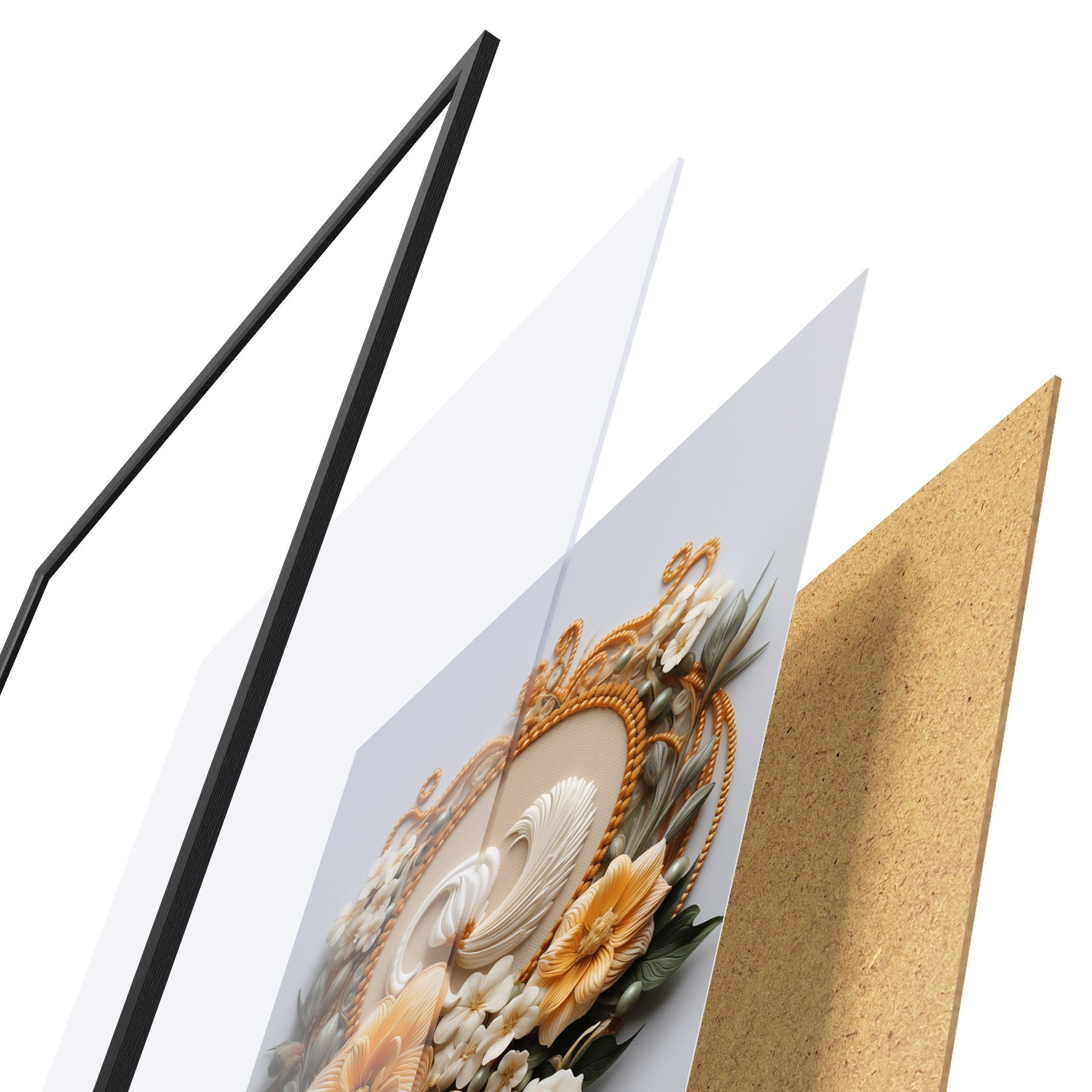 Le poster se compose d'un cadre, d'un plexiglas, d'une image imprimée et d'un support en aggloméré. Le poster peut être immédiatement accroché au mur grâce aux fixations au dos.