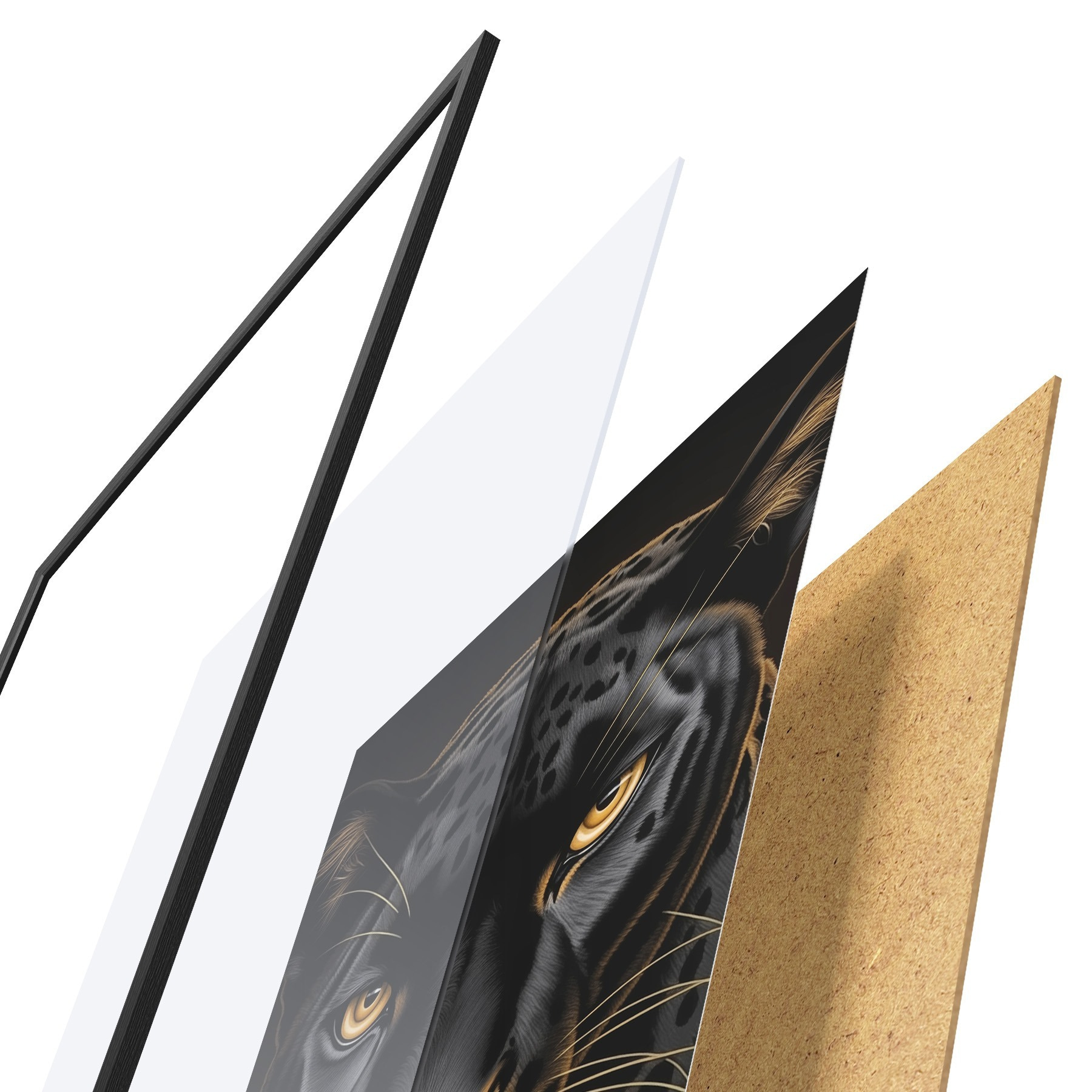 Le poster se compose d'un cadre, d'un plexiglas, d'une image imprimée et d'un support en aggloméré. Le poster peut être immédiatement accroché au mur grâce aux fixations au dos.