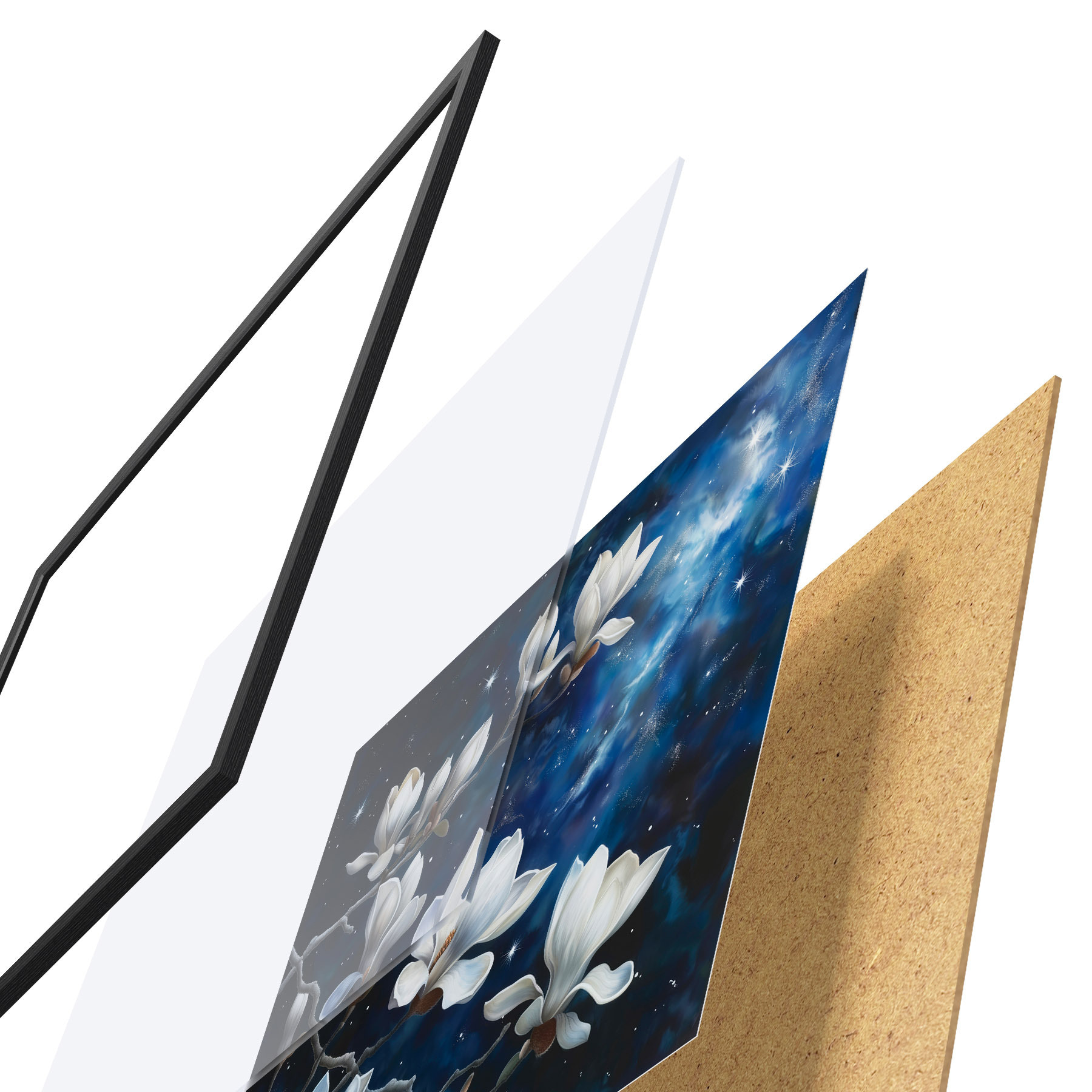Le poster se compose d'un cadre, d'un plexiglas, d'une image imprimée et d'un support en aggloméré. Le poster peut être immédiatement accroché au mur grâce aux fixations au dos.