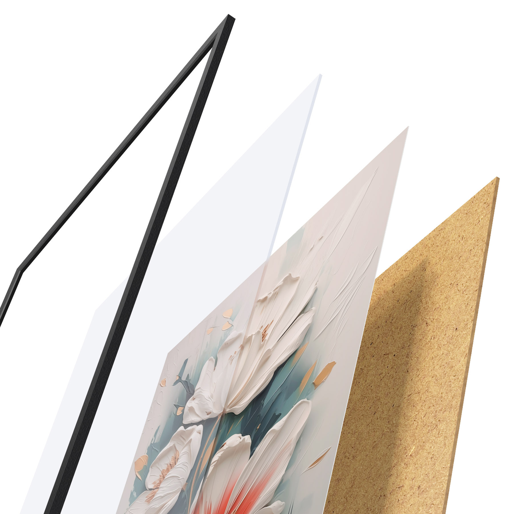 Le poster se compose d'un cadre, d'un plexiglas, d'une image imprimée et d'un support en aggloméré. Le poster peut être immédiatement accroché au mur grâce aux fixations au dos.