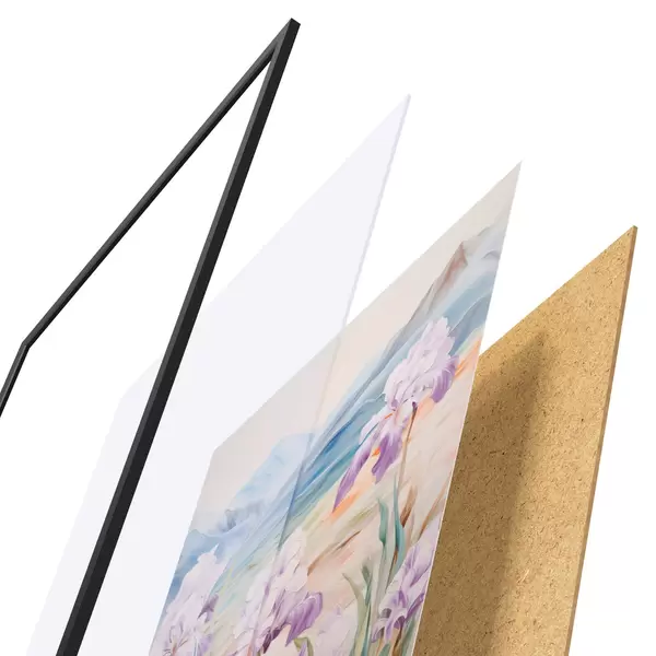 Le poster se compose d'un cadre, d'un plexiglas, d'une image imprimée et d'un support en aggloméré. Le poster peut être immédiatement accroché au mur grâce aux fixations au dos.