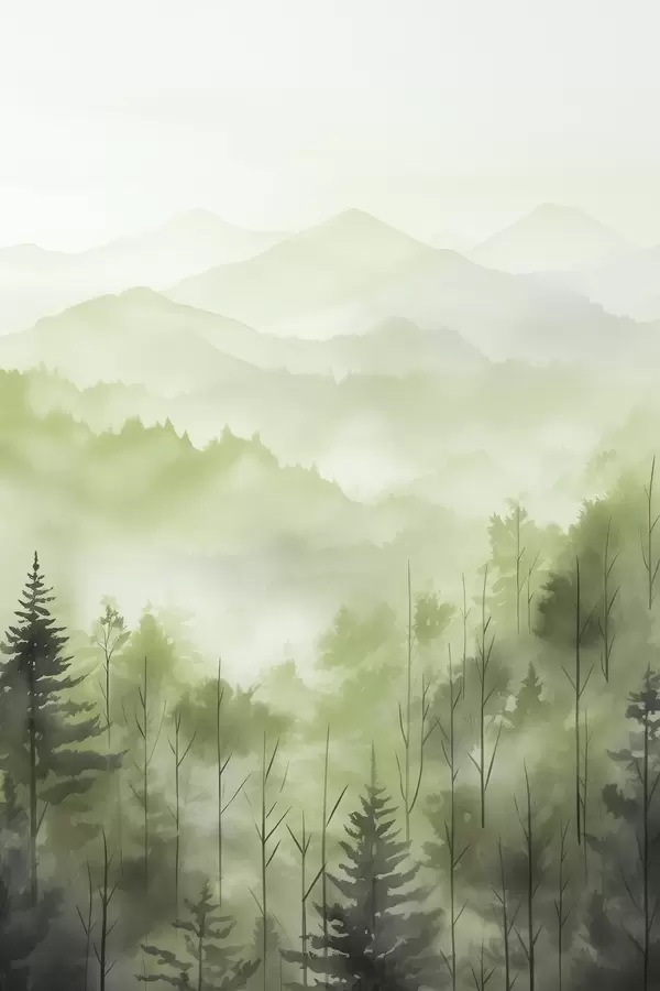 Affiche Montagnes avec paysage forestier, couleurs vertes, style aquarelle Non f44606