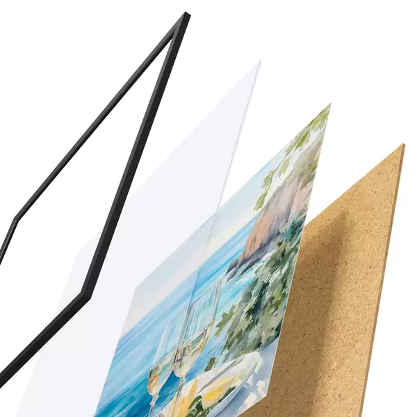 Le poster se compose d'un cadre, d'un plexiglas, d'une image imprimée et d'un support en aggloméré. Le poster peut être immédiatement accroché au mur grâce aux fixations au dos.