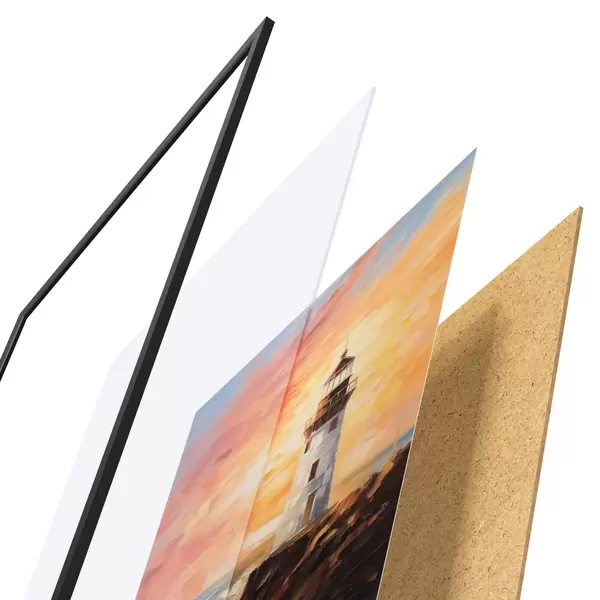 Le poster se compose d'un cadre, d'un plexiglas, d'une image imprimée et d'un support en aggloméré. Le poster peut être immédiatement accroché au mur grâce aux fixations au dos.