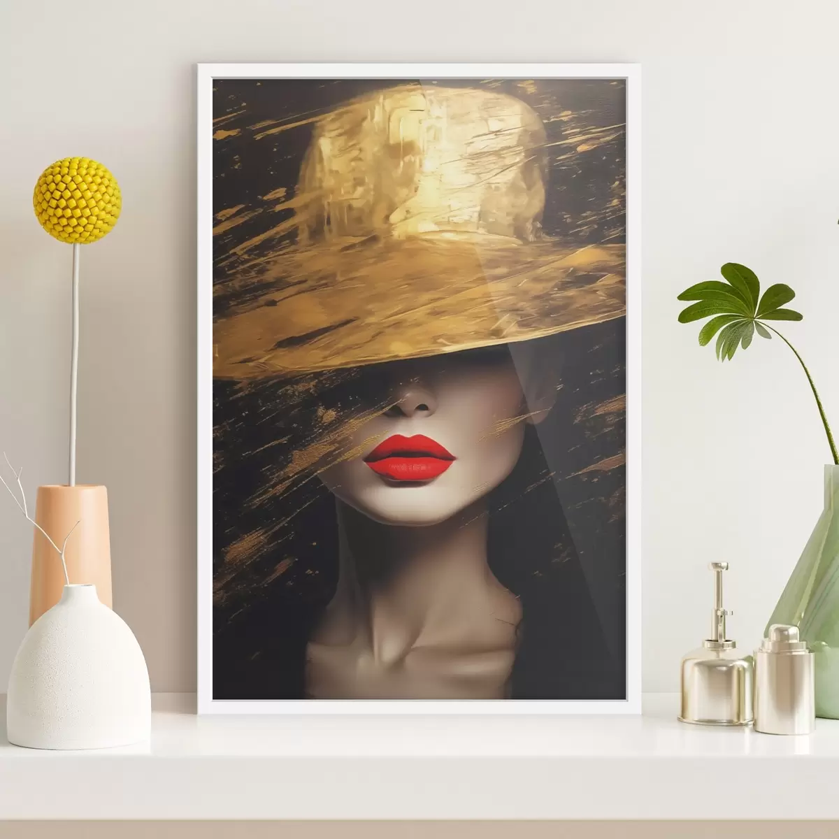 Affiche Visage féminin avec rouge à lèvres rouge sous un chapeau large Non f44691