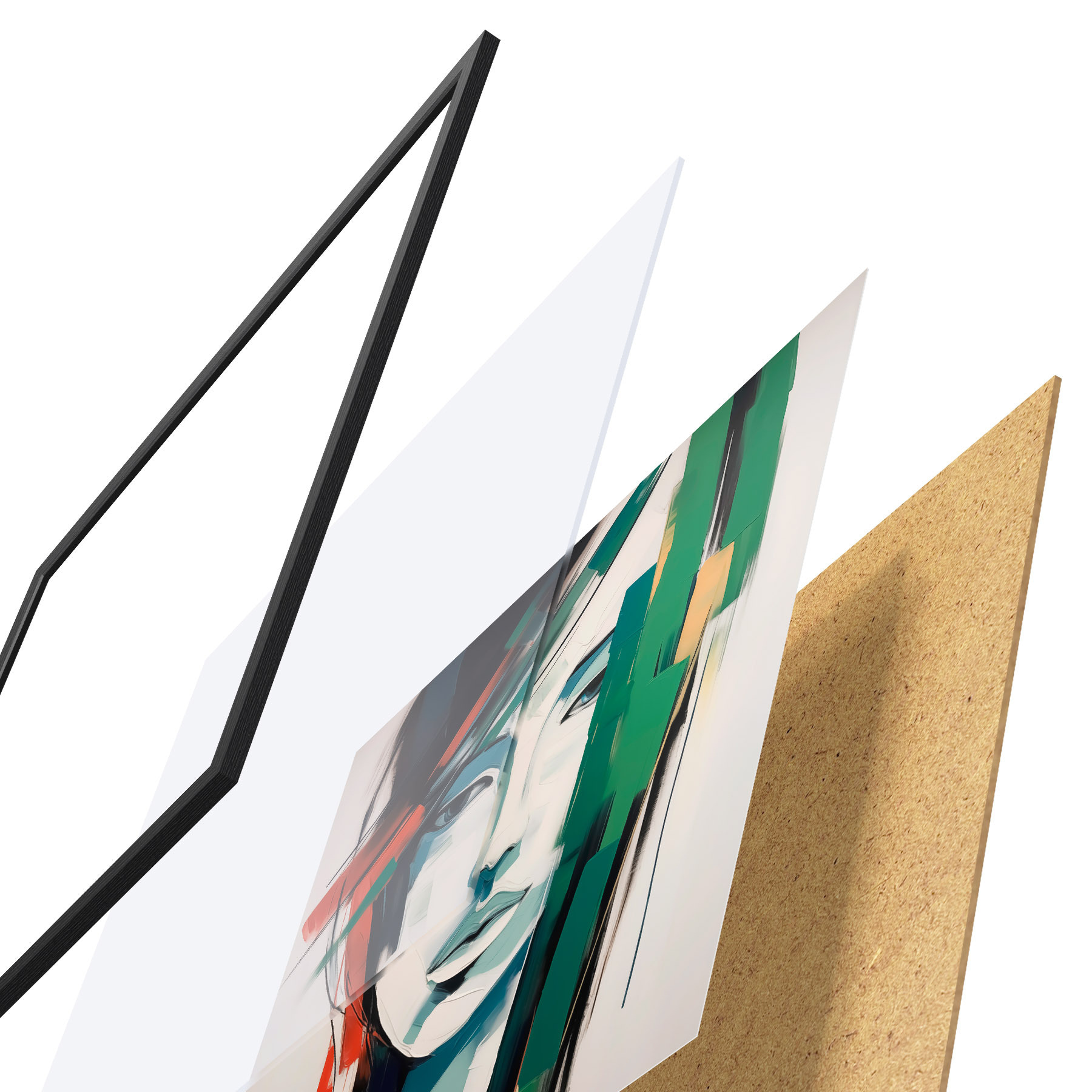 Le poster se compose d'un cadre, d'un plexiglas, d'une image imprimée et d'un support en aggloméré. Le poster peut être immédiatement accroché au mur grâce aux fixations au dos.