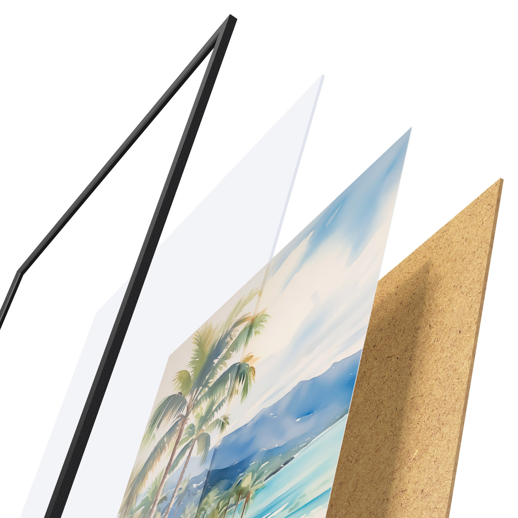 Le poster se compose d'un cadre, d'un plexiglas, d'une image imprimée et d'un support en aggloméré. Le poster peut être immédiatement accroché au mur grâce aux fixations au dos.