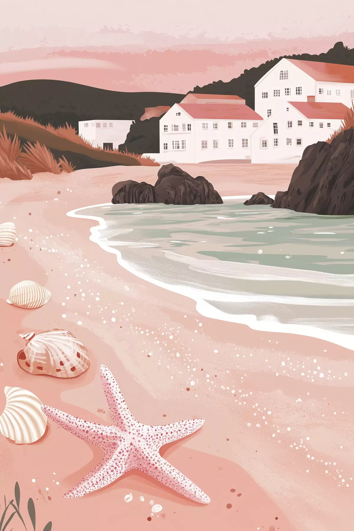 Affiche Douce plage rose avec des maisons blanches et des coquillages Non f44713
