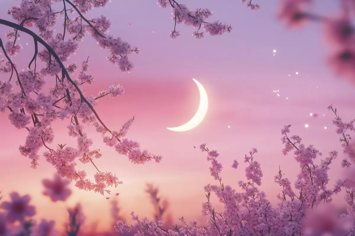 Affiche Fleur de cerisier, ciel rose avec lune brillante, réalisme f44715