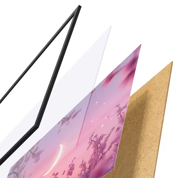 Le poster se compose d'un cadre, d'un plexiglas, d'une image imprimée et d'un support en aggloméré. Le poster peut être immédiatement accroché au mur grâce aux fixations au dos.