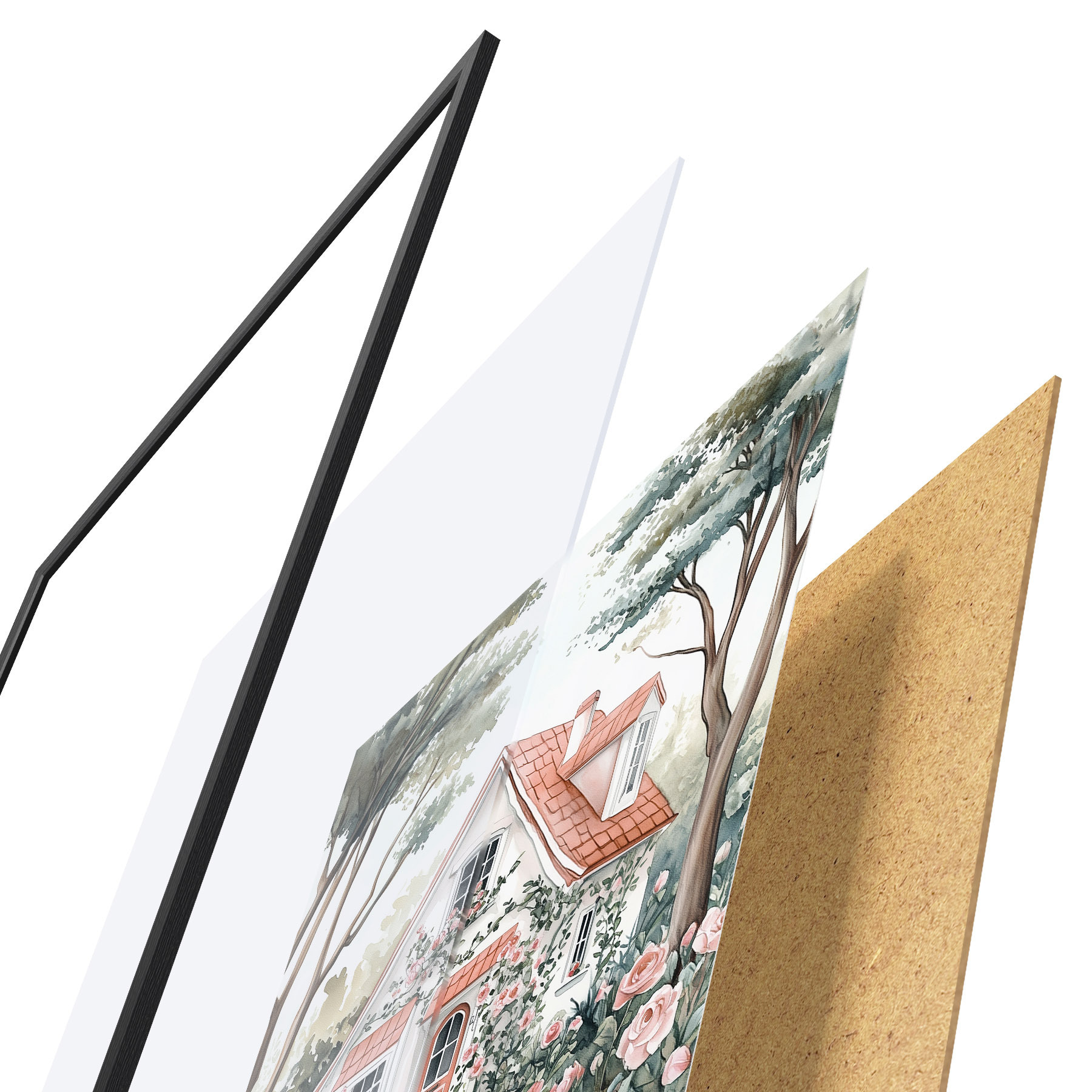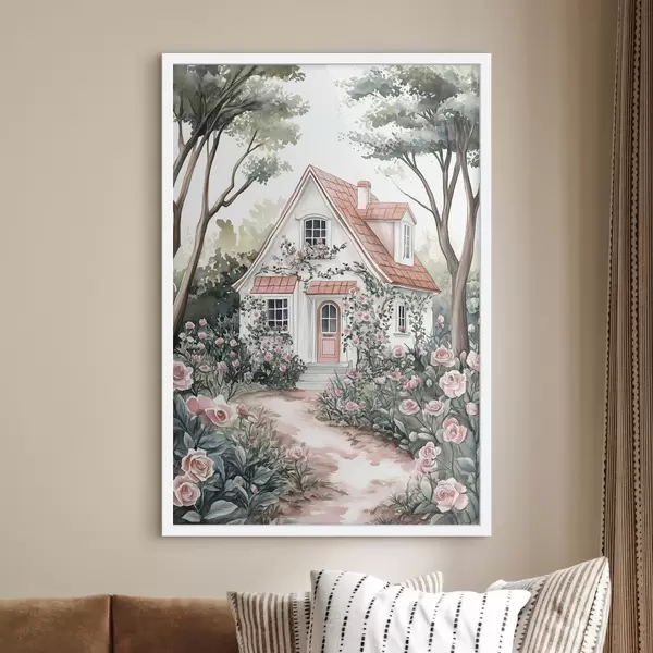 Affiche Maison blanche avec jardin de roses dans les bois f44716