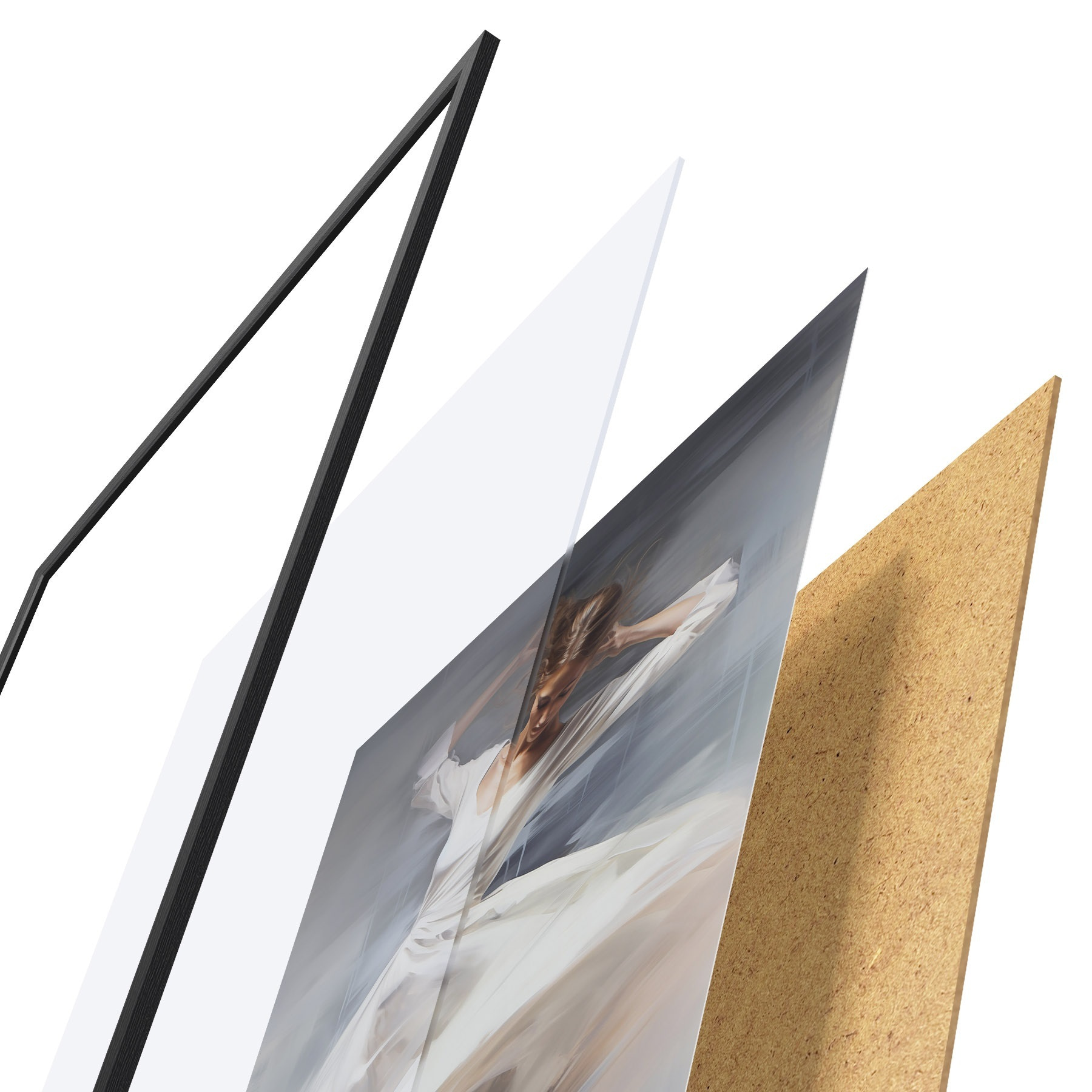Le poster se compose d'un cadre, d'un plexiglas, d'une image imprimée et d'un support en aggloméré. Le poster peut être immédiatement accroché au mur grâce aux fixations au dos.