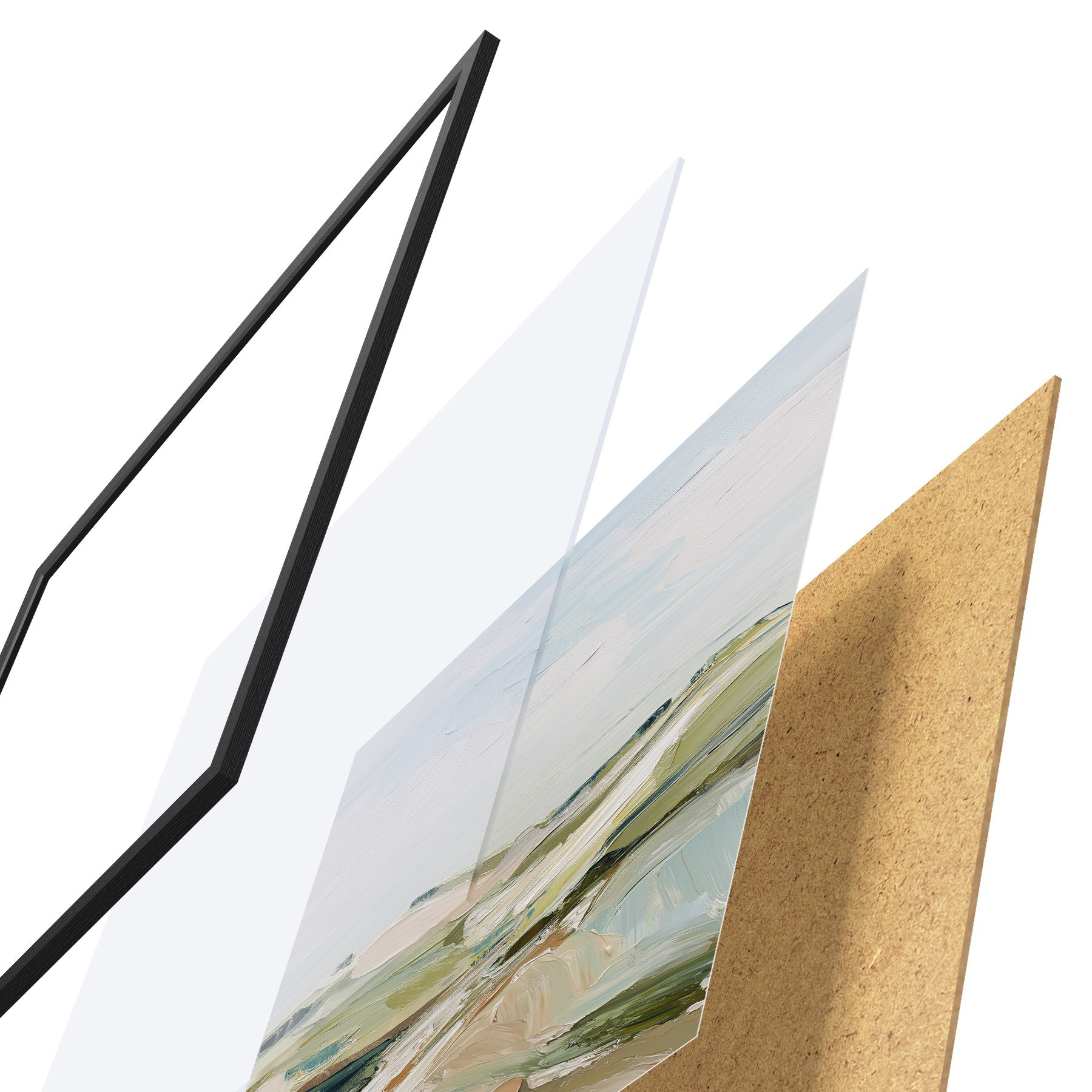 Le poster se compose d'un cadre, d'un plexiglas, d'une image imprimée et d'un support en aggloméré. Le poster peut être immédiatement accroché au mur grâce aux fixations au dos.