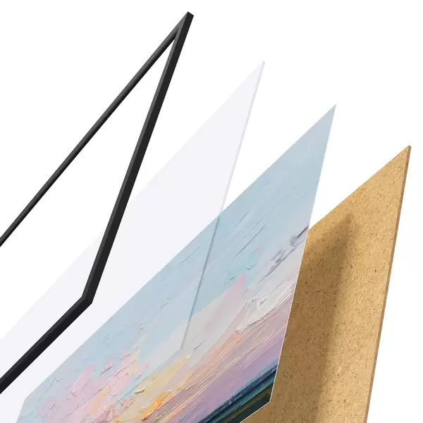 Le poster se compose d'un cadre, d'un plexiglas, d'une image imprimée et d'un support en aggloméré. Le poster peut être immédiatement accroché au mur grâce aux fixations au dos.