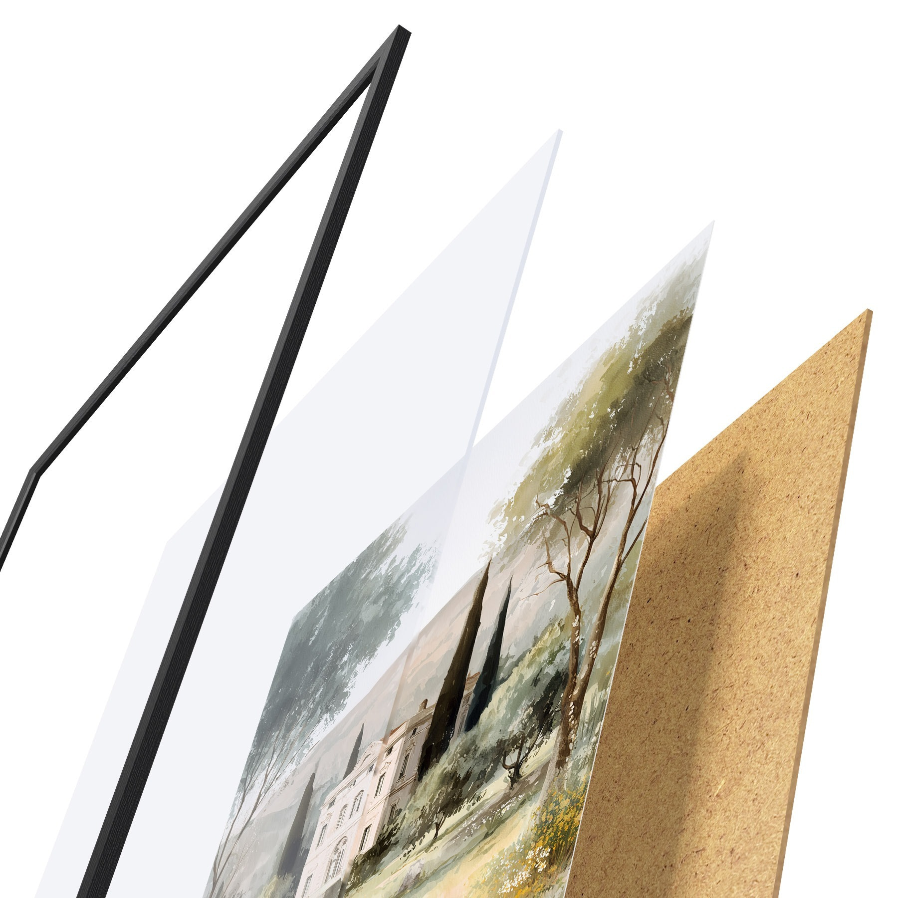 Le poster se compose d'un cadre, d'un plexiglas, d'une image imprimée et d'un support en aggloméré. Le poster peut être immédiatement accroché au mur grâce aux fixations au dos.