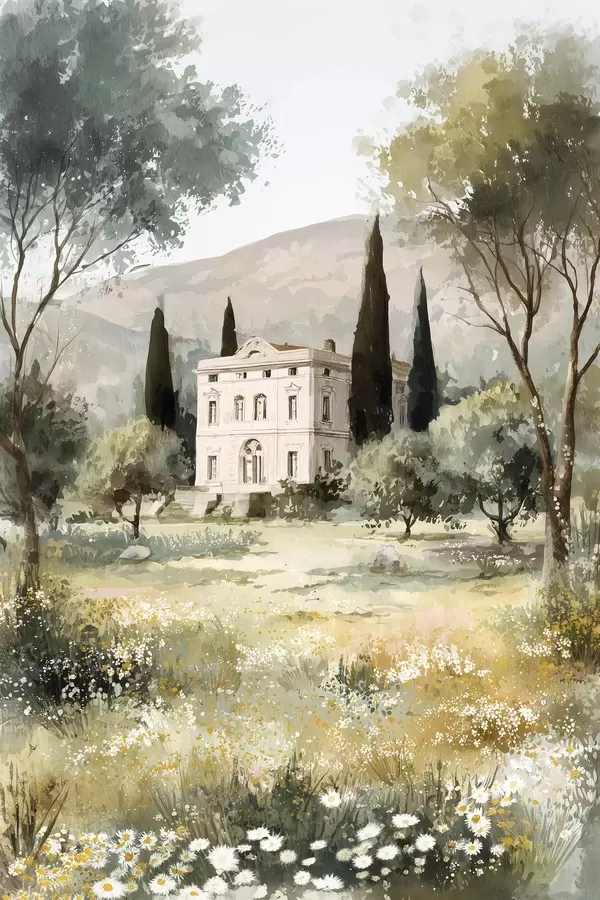 Affiche Village méditerranéen avec maison blanche entourée de jardin f44796