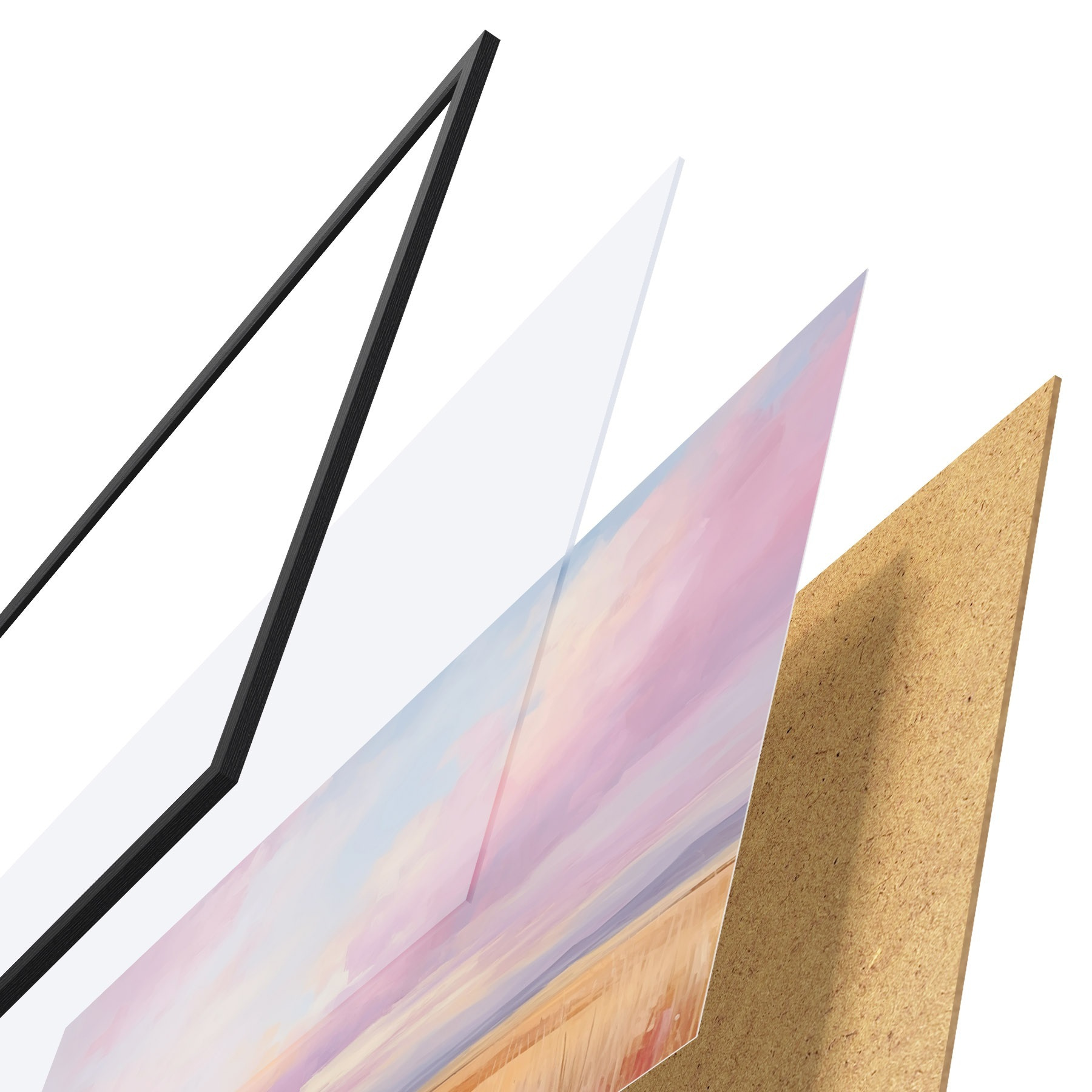 Le poster se compose d'un cadre, d'un plexiglas, d'une image imprimée et d'un support en aggloméré. Le poster peut être immédiatement accroché au mur grâce aux fixations au dos.