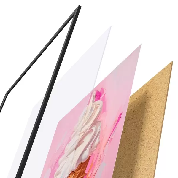 Le poster se compose d'un cadre, d'un plexiglas, d'une image imprimée et d'un support en aggloméré. Le poster peut être immédiatement accroché au mur grâce aux fixations au dos.