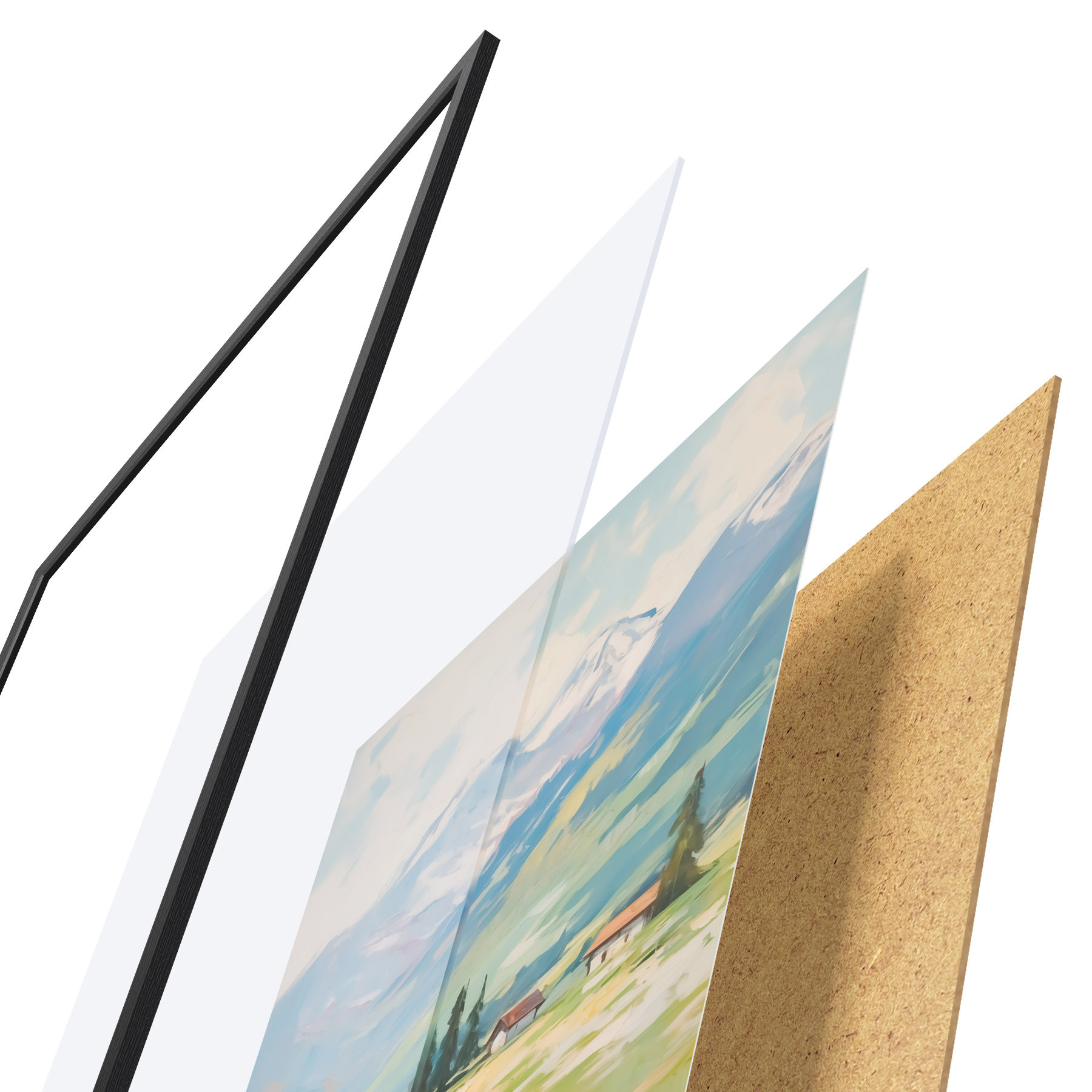 Le poster se compose d'un cadre, d'un plexiglas, d'une image imprimée et d'un support en aggloméré. Le poster peut être immédiatement accroché au mur grâce aux fixations au dos.