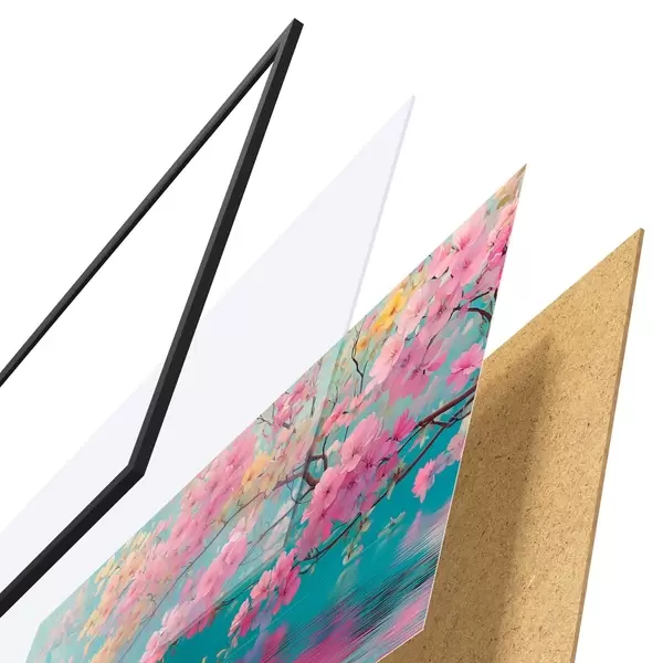 Le poster se compose d'un cadre, d'un plexiglas, d'une image imprimée et d'un support en aggloméré. Le poster peut être immédiatement accroché au mur grâce aux fixations au dos.