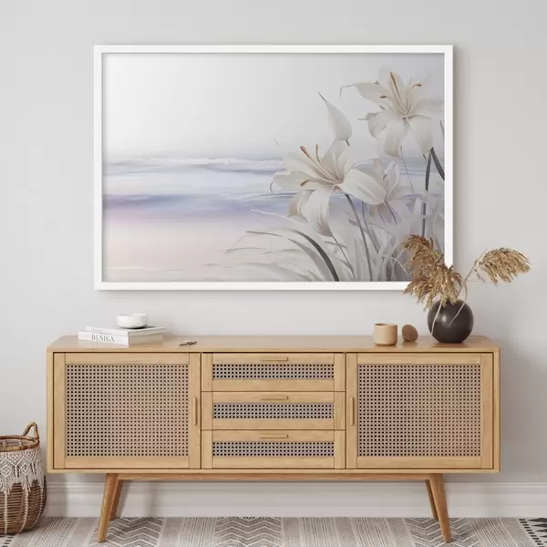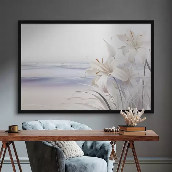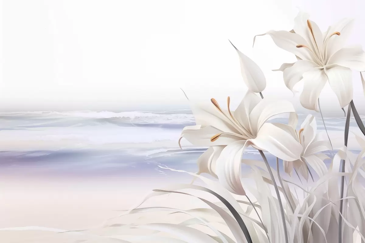 Affiche Lys blancs avec pistils orange et longues feuilles sur une plage avec des vagues douces en arrière-plan, couleurs pastel Non f44850