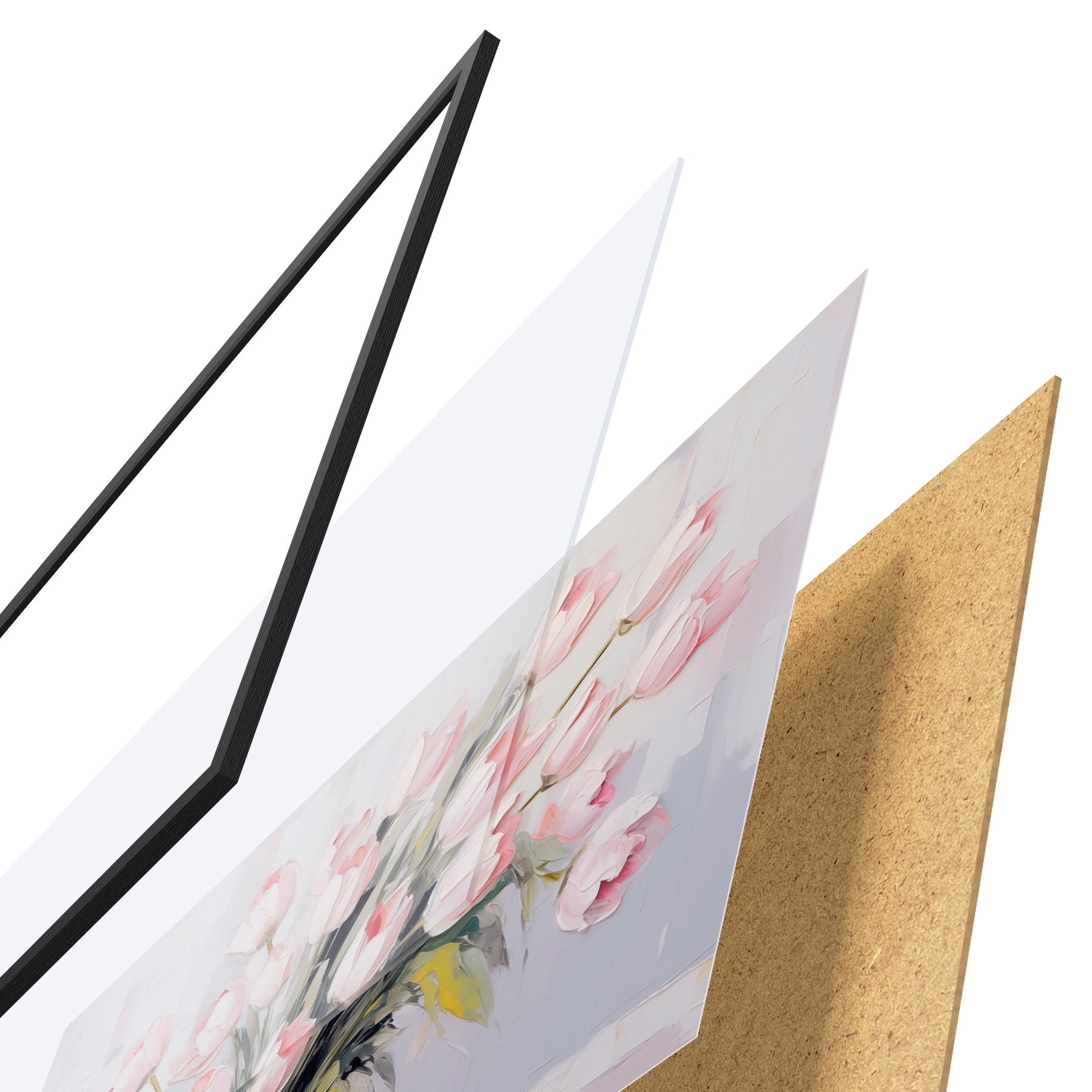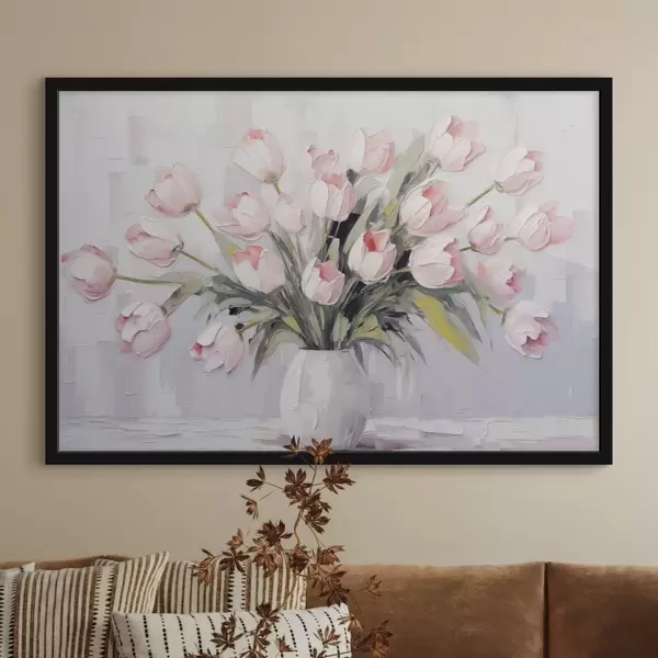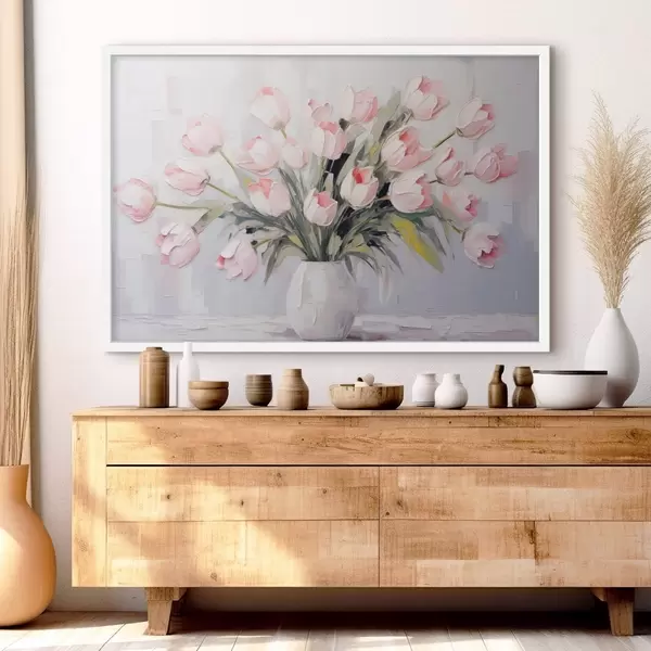 Affiche Un vase avec des tulipes roses, des feuilles vertes, fond gris clair, style peinture à l'huile, coups de pinceau épais Non f44852