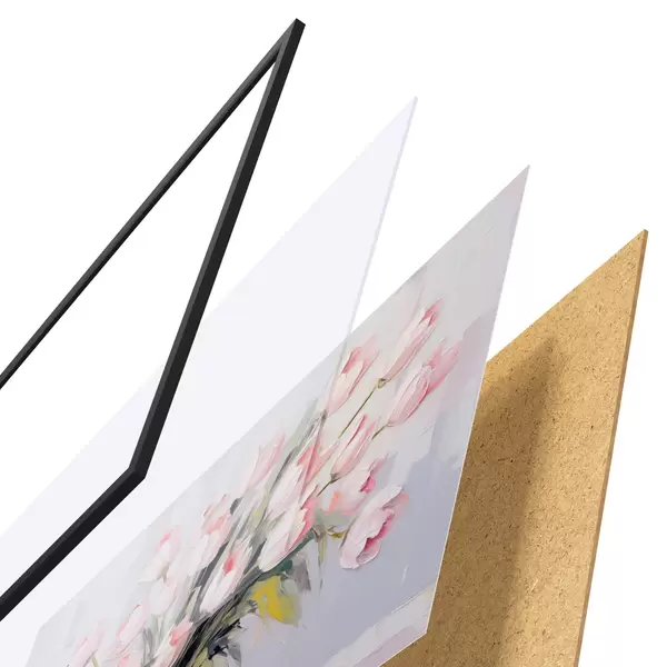Le poster se compose d'un cadre, d'un plexiglas, d'une image imprimée et d'un support en aggloméré. Le poster peut être immédiatement accroché au mur grâce aux fixations au dos.