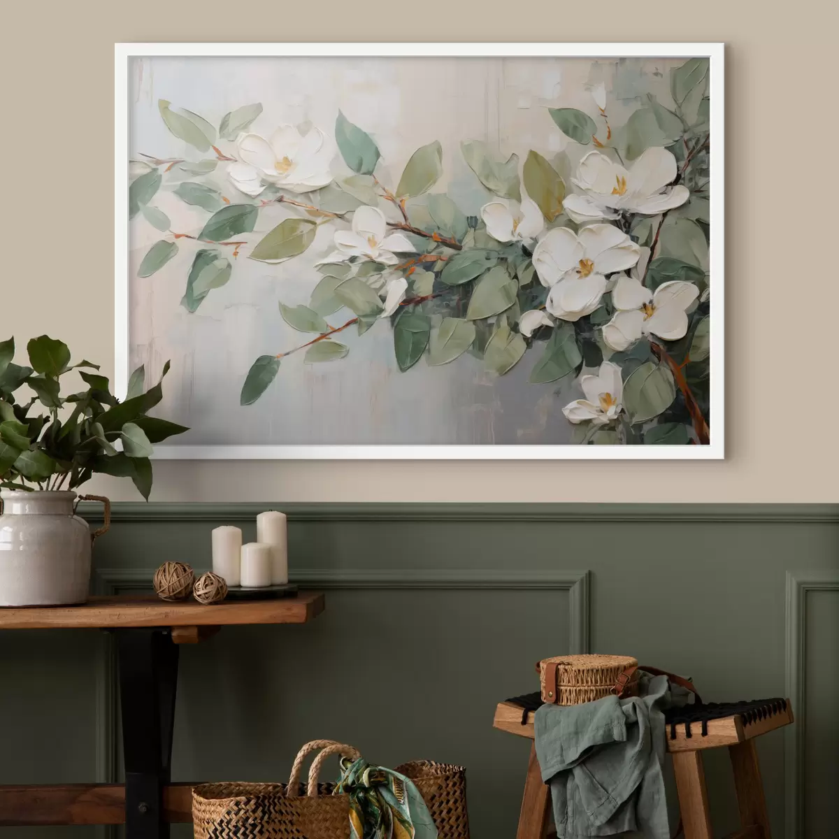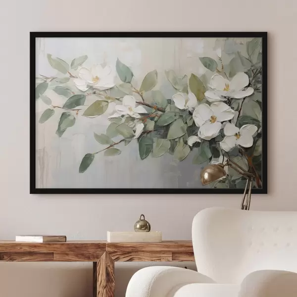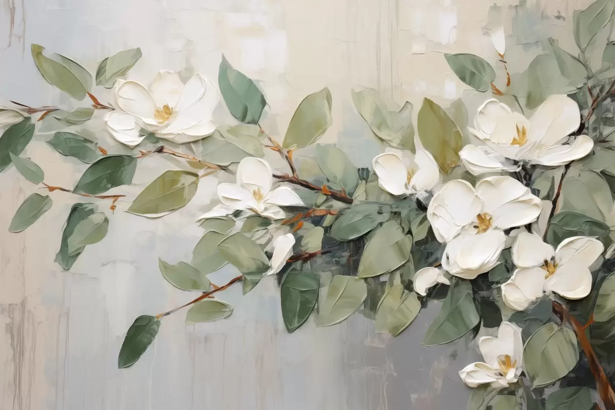 Affiche Fleurs de magnolia avec feuilles vertes sur une branche, style texturé par empâtement, palette de couleurs douces Non f44853