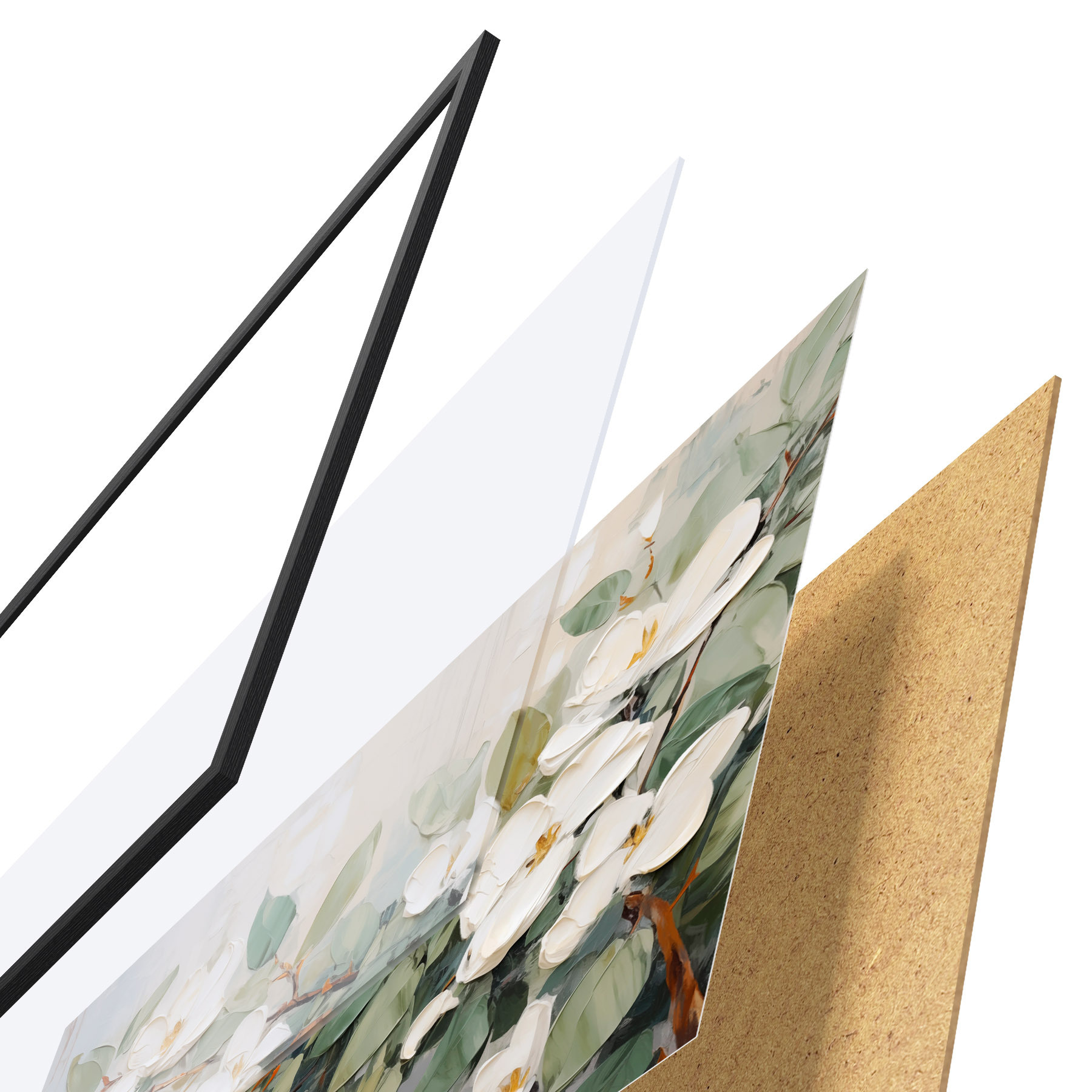 Le poster se compose d'un cadre, d'un plexiglas, d'une image imprimée et d'un support en aggloméré. Le poster peut être immédiatement accroché au mur grâce aux fixations au dos.