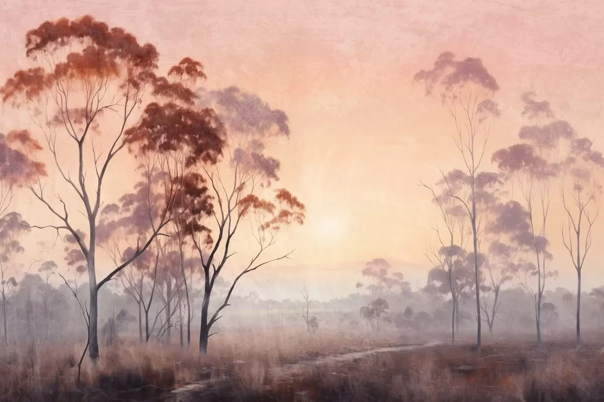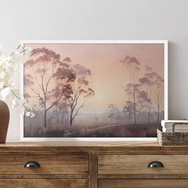 Affiche Peinture de paysage représentant un champ avec des herbes hautes et des arbres, avec le soleil en arrière-plan Non f44854