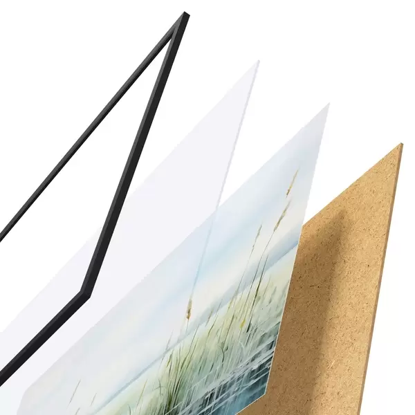 Le poster se compose d'un cadre, d'un plexiglas, d'une image imprimée et d'un support en aggloméré. Le poster peut être immédiatement accroché au mur grâce aux fixations au dos.
