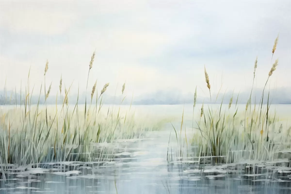 Affiche Une peinture à l'aquarelle imitant les hautes herbes poussant près de l'eau, un ciel couvert et un arrière-plan flou f44860