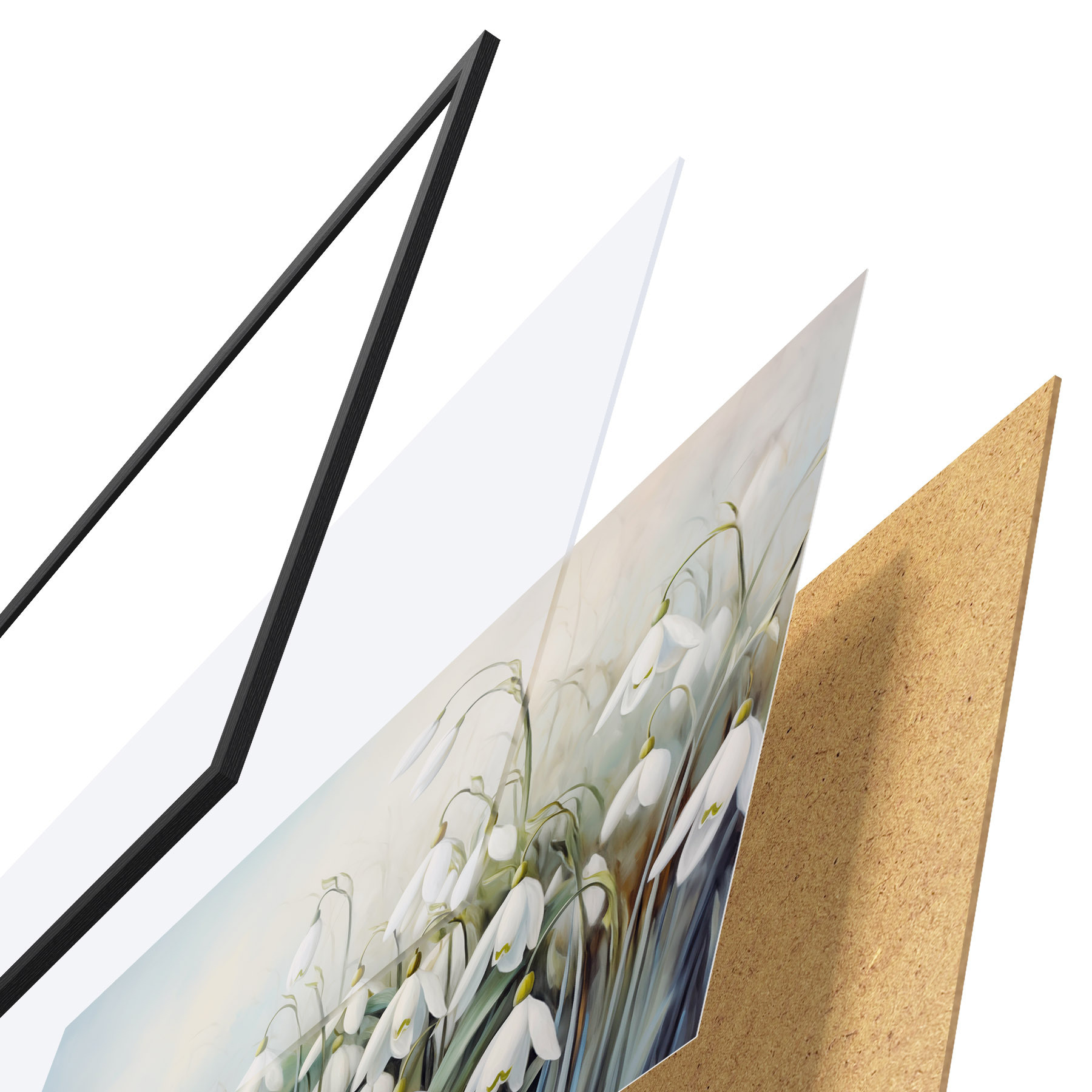 Affiche Fleurs blanches de perce-neige avec des tiges et des feuilles bleues et vertes, coups de pinceau doux, arrière-plan flou Non f44864