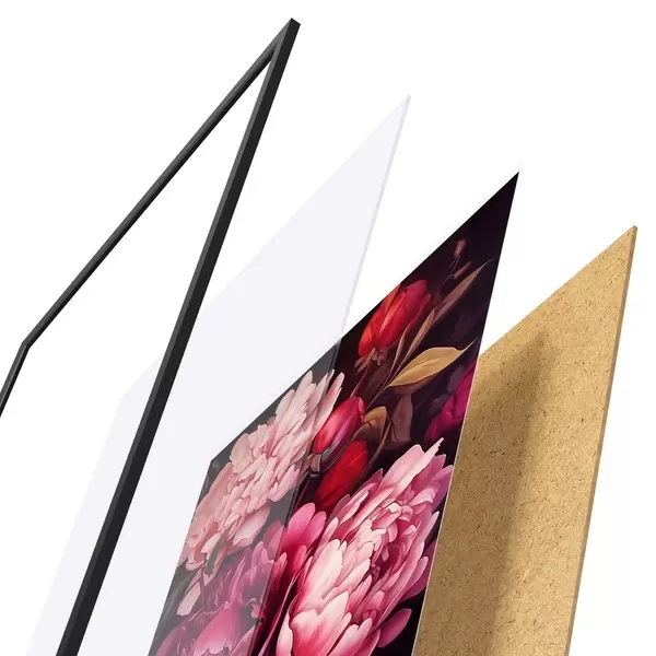 Le poster se compose d'un cadre, d'un plexiglas, d'une image imprimée et d'un support en aggloméré. Le poster peut être immédiatement accroché au mur grâce aux fixations au dos.