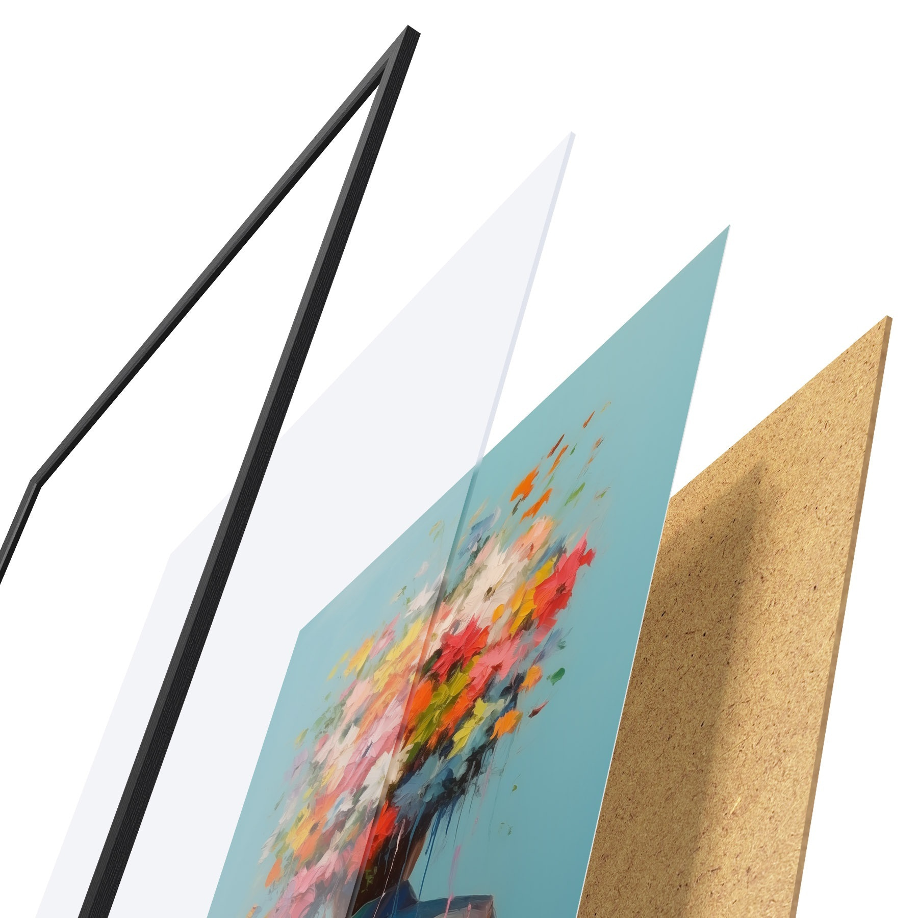 Le poster se compose d'un cadre, d'un plexiglas, d'une image imprimée et d'un support en aggloméré. Le poster peut être immédiatement accroché au mur grâce aux fixations au dos.