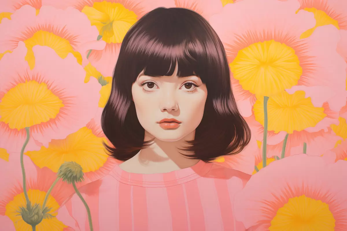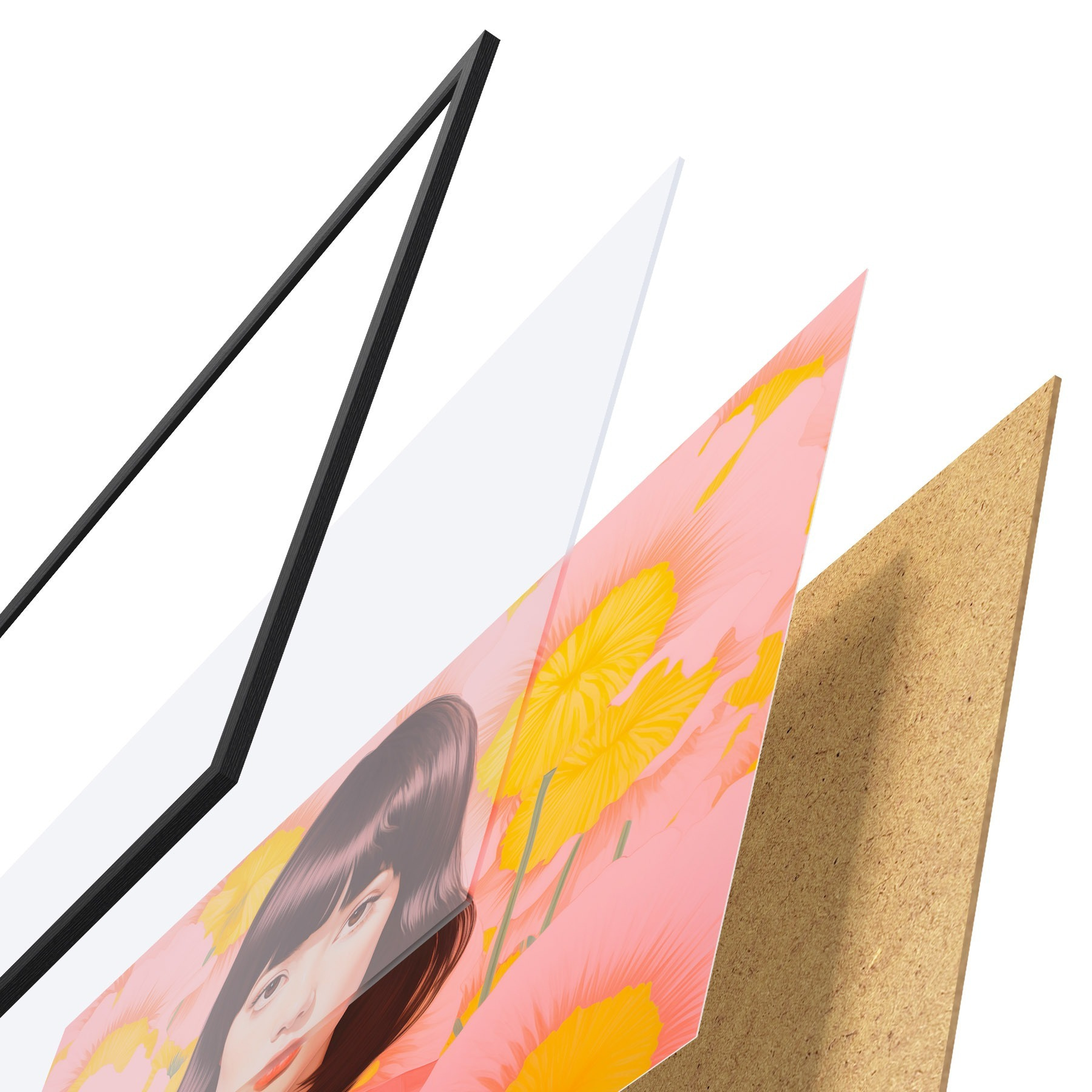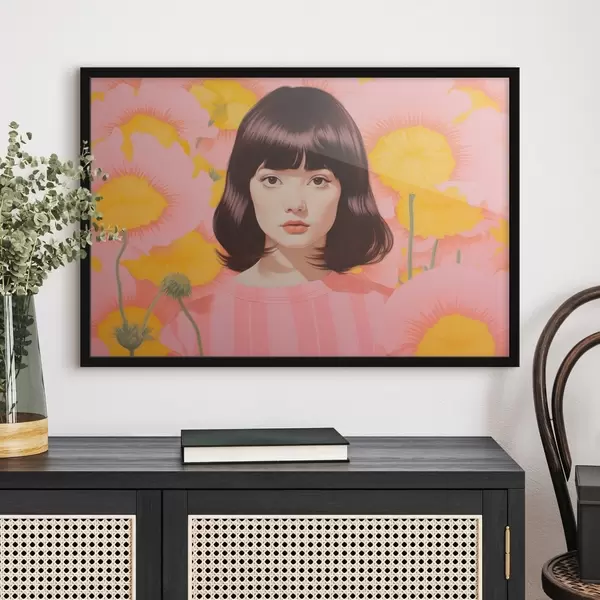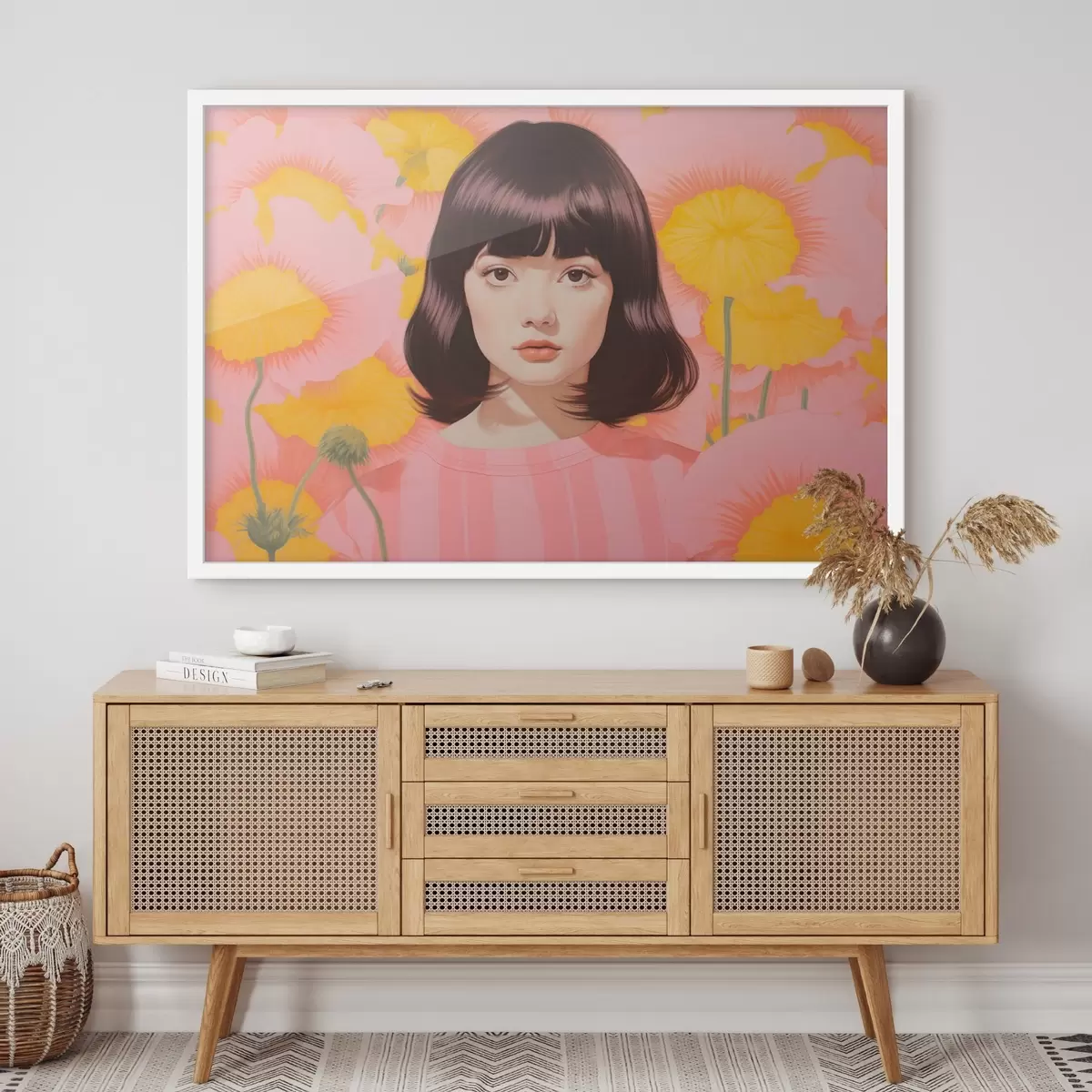 Affiche Portrait minimaliste décoratif d'une jeune fille asiatique dans un champ de fleurs jaunes et roses Non f44924
