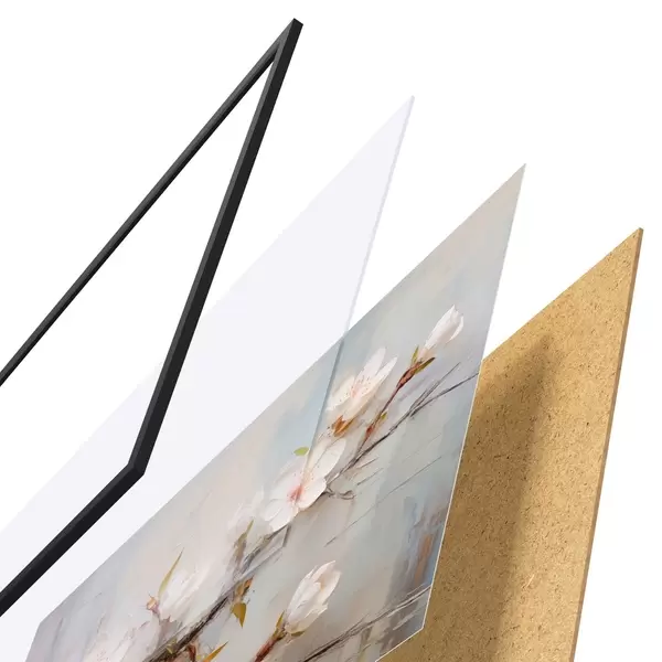 Le poster se compose d'un cadre, d'un plexiglas, d'une image imprimée et d'un support en aggloméré. Le poster peut être immédiatement accroché au mur grâce aux fixations au dos.