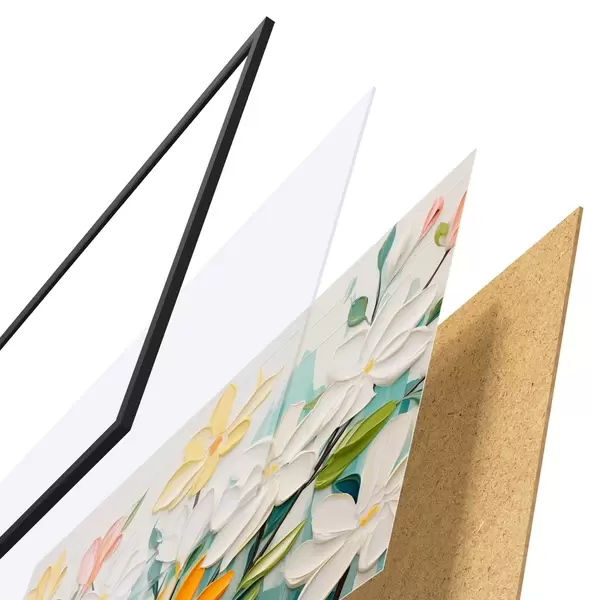 Le poster se compose d'un cadre, d'un plexiglas, d'une image imprimée et d'un support en aggloméré. Le poster peut être immédiatement accroché au mur grâce aux fixations au dos.