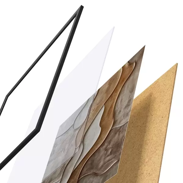 Le poster se compose d'un cadre, d'un plexiglas, d'une image imprimée et d'un support en aggloméré. Le poster peut être immédiatement accroché au mur grâce aux fixations au dos.