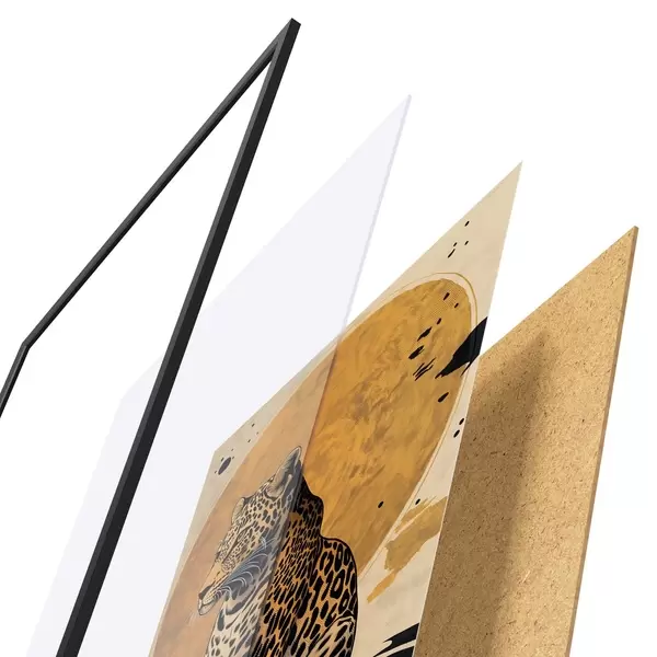 Le poster se compose d'un cadre, d'un plexiglas, d'une image imprimée et d'un support en aggloméré. Le poster peut être immédiatement accroché au mur grâce aux fixations au dos.
