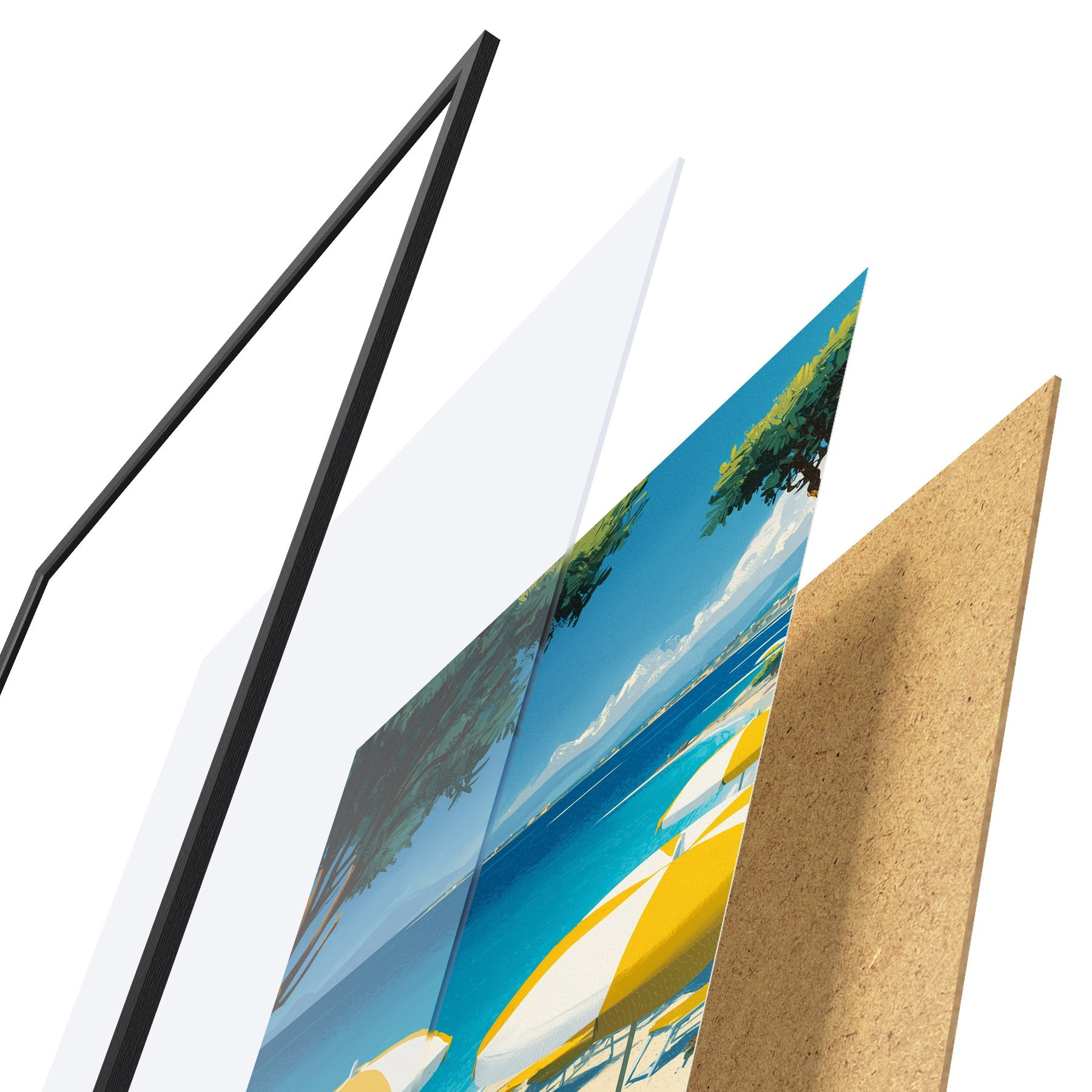 Le poster se compose d'un cadre, d'un plexiglas, d'une image imprimée et d'un support en aggloméré. Le poster peut être immédiatement accroché au mur grâce aux fixations au dos.